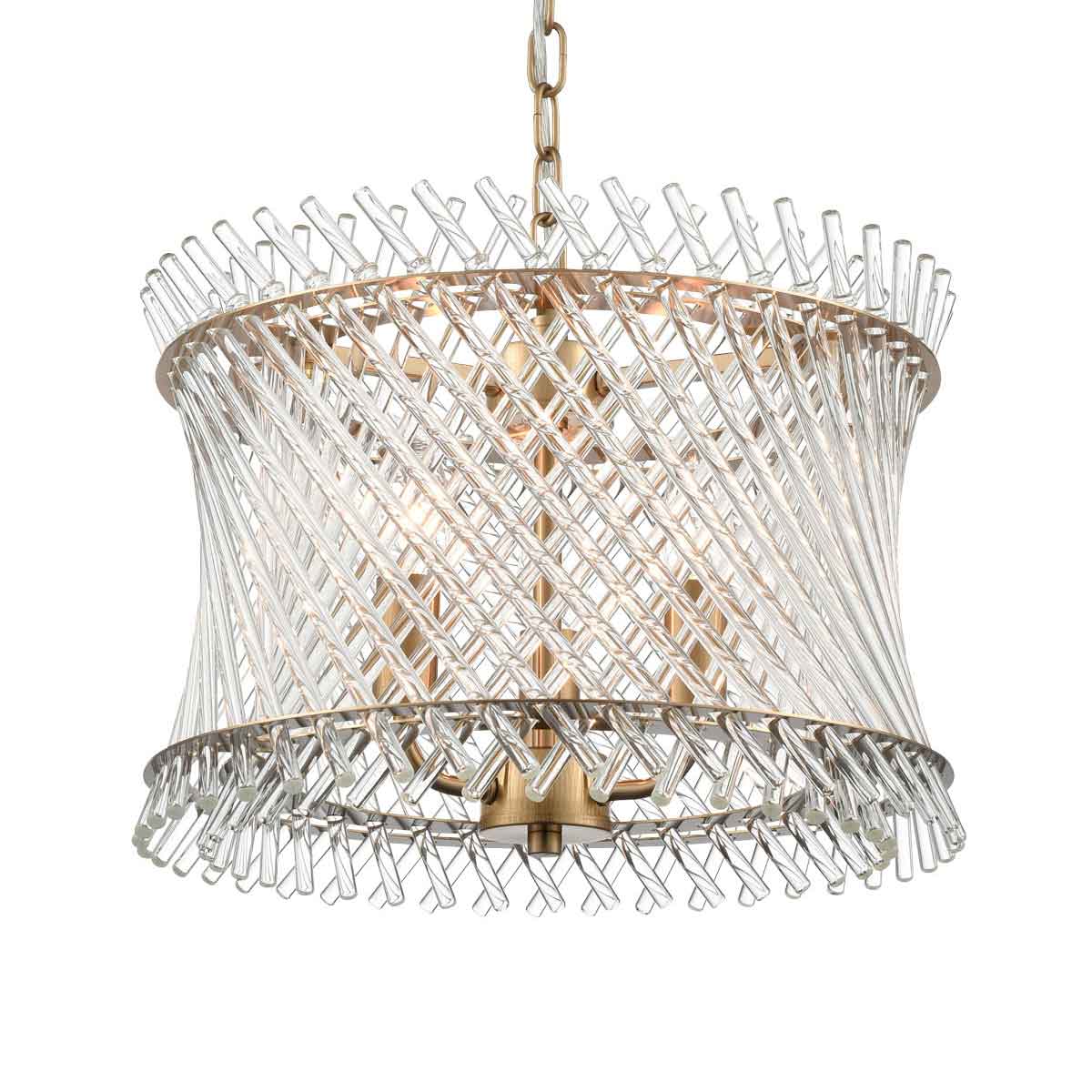 The Ethereal 3 light modern chandelier in aged brass with glass rods from Franklite is contemporary and spectacular. Featuring a circular ceiling mount, chain suspension and circular frame top and bottom, connected by a mass of diagonal clear glass rods. A 3 light candelabra sits inside, creating the most wonderful display.