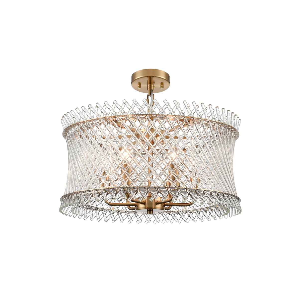 The Ethereal 6 light modern chandelier in aged brass with glass rods from Franklite is contemporary and spectacular. Featuring a circular ceiling mount, chain suspension and circular frame top and bottom, connected by a mass of diagonal clear glass rods. A six light candelabra sits inside, creating the most wonderful display.