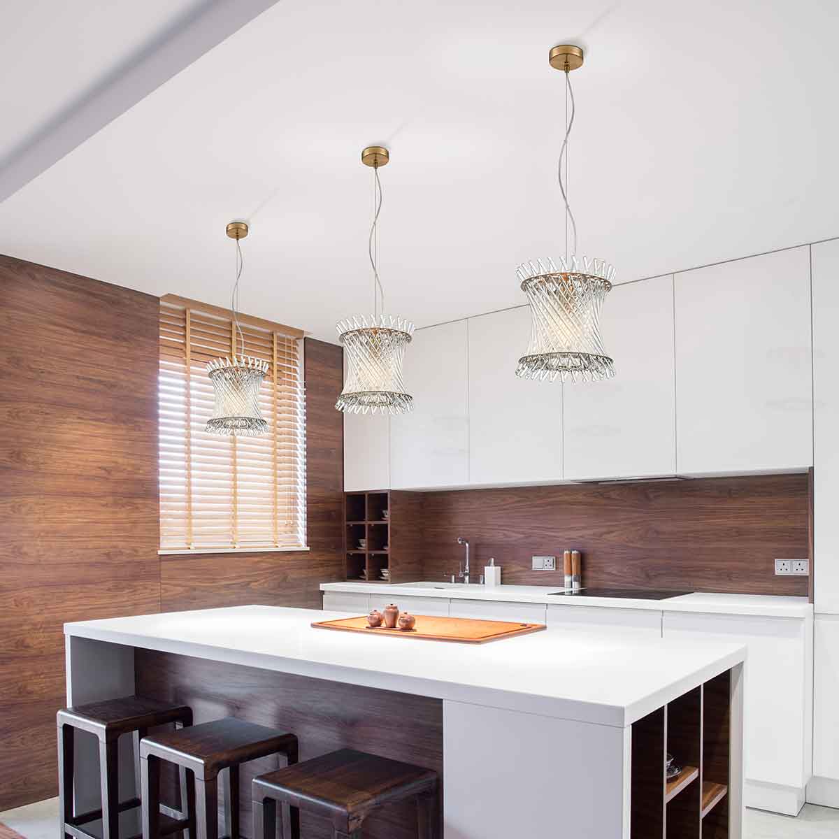 The Ethereal single contemporary pendant in aged brass with glass rods from Franklite is stunning and spectacular. Featuring a circular ceiling mount, fine wire suspension and circular discs top and bottom, connected by a mass of diagonal clear glass rods. The sooth clear glass rods surround the bulb, creating the most wonderful display.