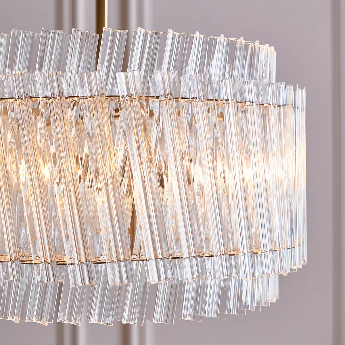 This exquisite 3 light pendant in brushed aged brass with glass rods is modern and sophisticated. Featuring a beautiful 42cm diameter circle with two layers of angled glass rods surrounding 3 lights inside a circular frame. Suspended from chain and clear encased flex, it’s a perfect balance of shimmering beauty and timeless elegance.