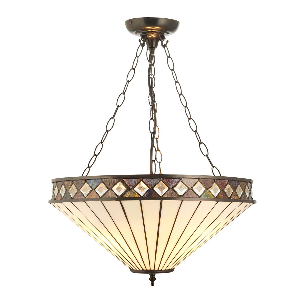 A bright Art Deco style Tiffany design featuring a large inverted shade, with opaque triangular glass sections radiating from the centre. Diamond shaped clear glass and translucent rippled amber with hints of green highlight the drop edge rim. Attached by a satin black finish ceiling mount and multiple chains, it’s height adjustable, gives plenty of light and dimmable too.