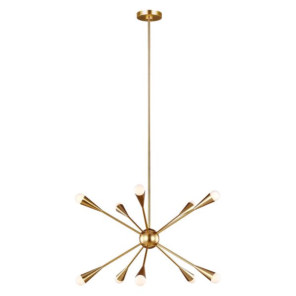 The Feiss Jax 10 light modern chandelier ceiling pendant in burnished brass finish is stylish. Featuring circular ceiling mount, rod suspension and central ball in burnished brass. Ten slender arms radiate from the ball, with cone shaped tips and opal shades containing the bulbs. The arms create a starburst silhouette and the opal shades soften the light.