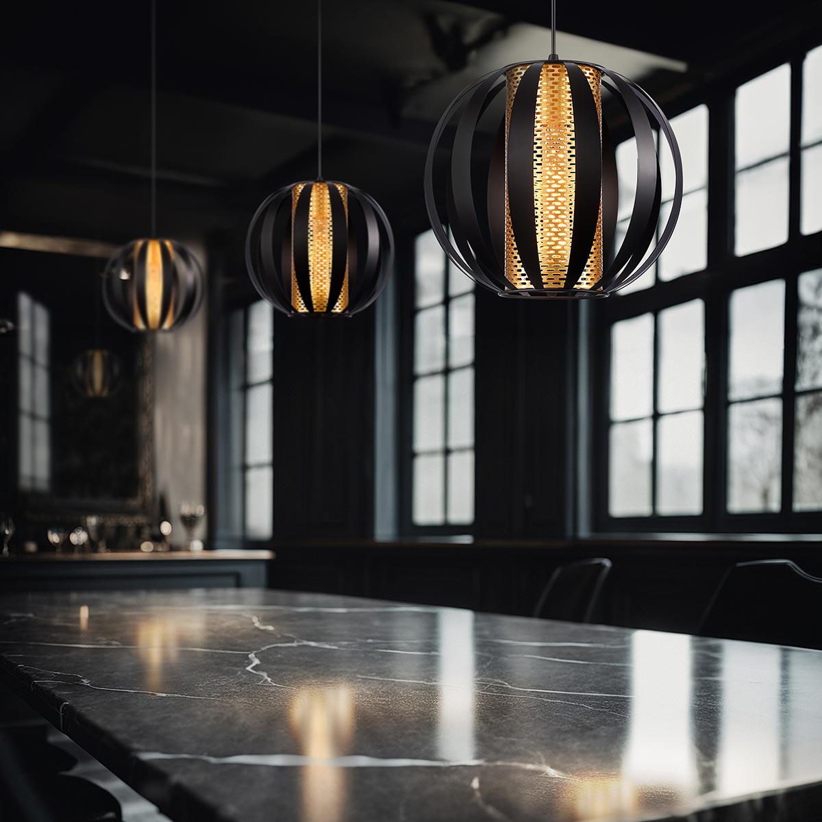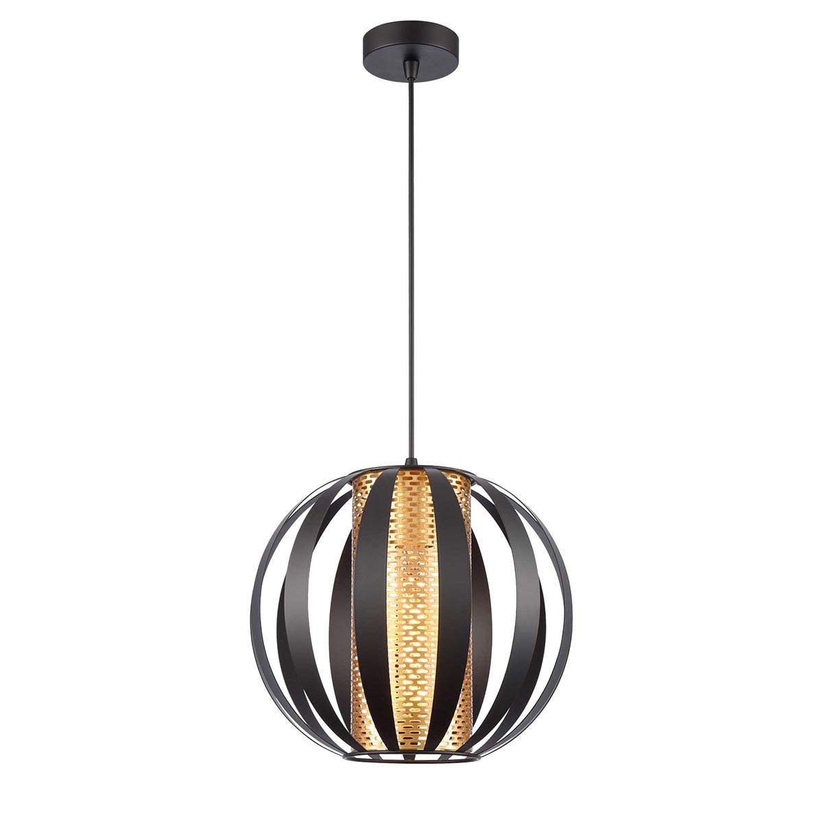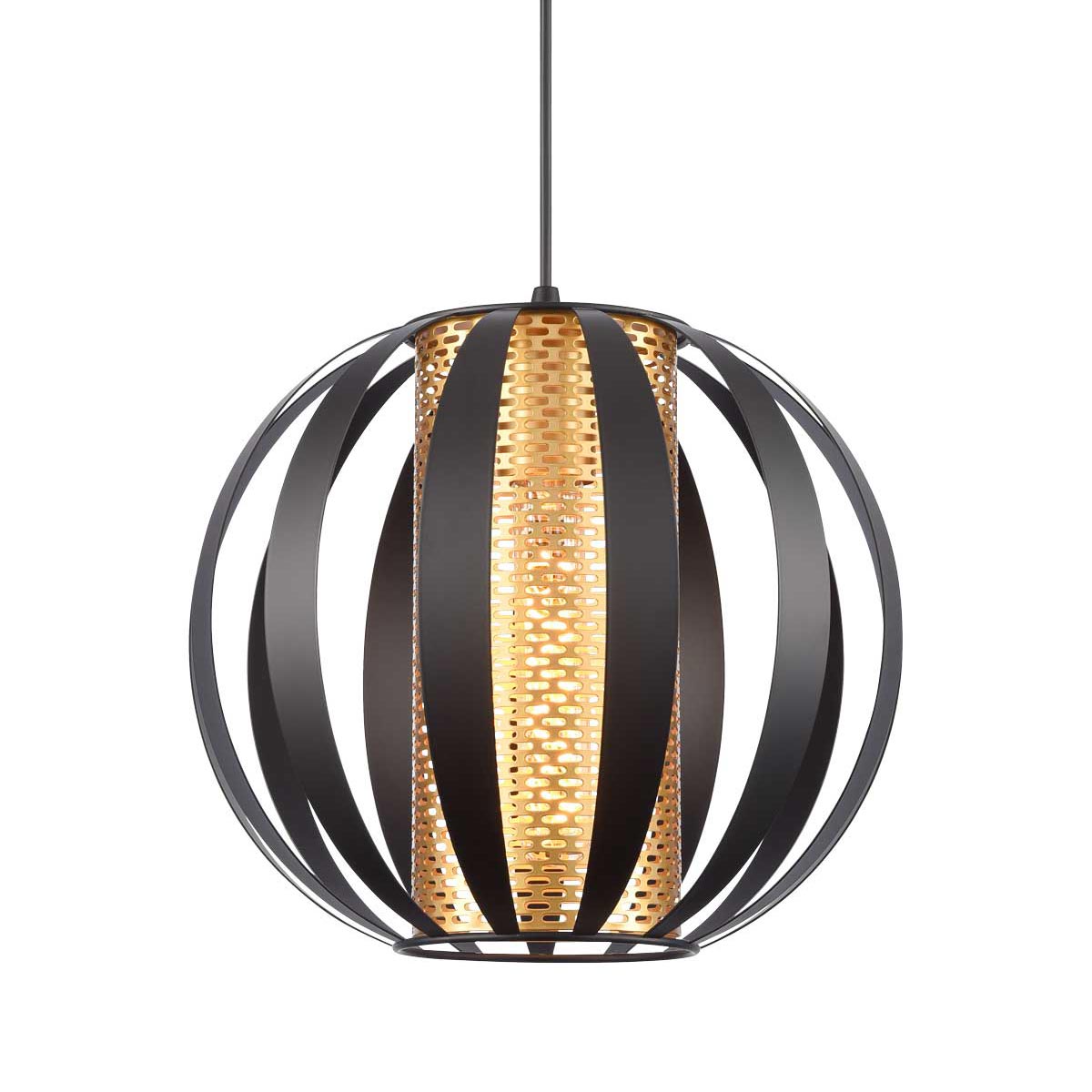 Modern and stylish, the Flare black and gold medium single pendant or flush light from Franklite is ideal for over a breakfast bar or dining table. Featuring a circular ceiling mount, black suspension cable and honeycomb inner cylinder shade in gold, with a 300mm diameter open globe outer frame for a contemporary look. Can be used as a pendant or mounted flush to the ceiling.