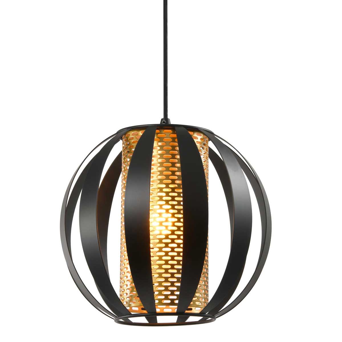 Modern and stylish, the Flare black and gold small single pendant or flush light from Franklite is ideal for over a breakfast bar or dining table. Featuring a circular ceiling mount, black suspension cable and honeycomb inner cylinder shade in gold, with a 250mm diameter open globe outer frame for a contemporary look. Can be used as a pendant or mounted flush to the ceiling.