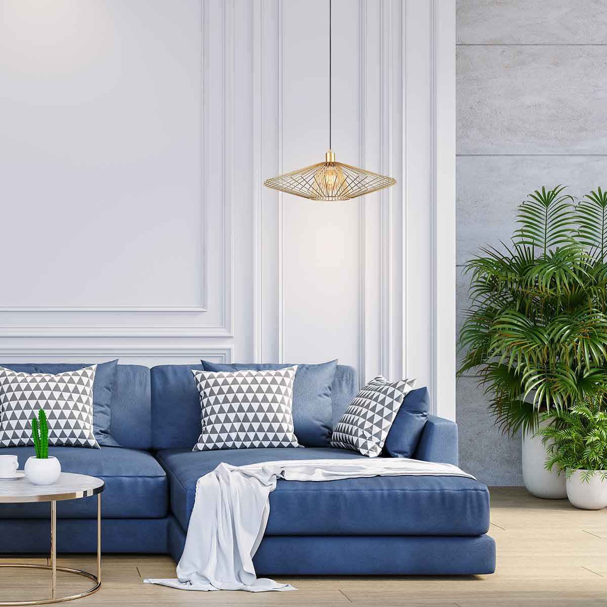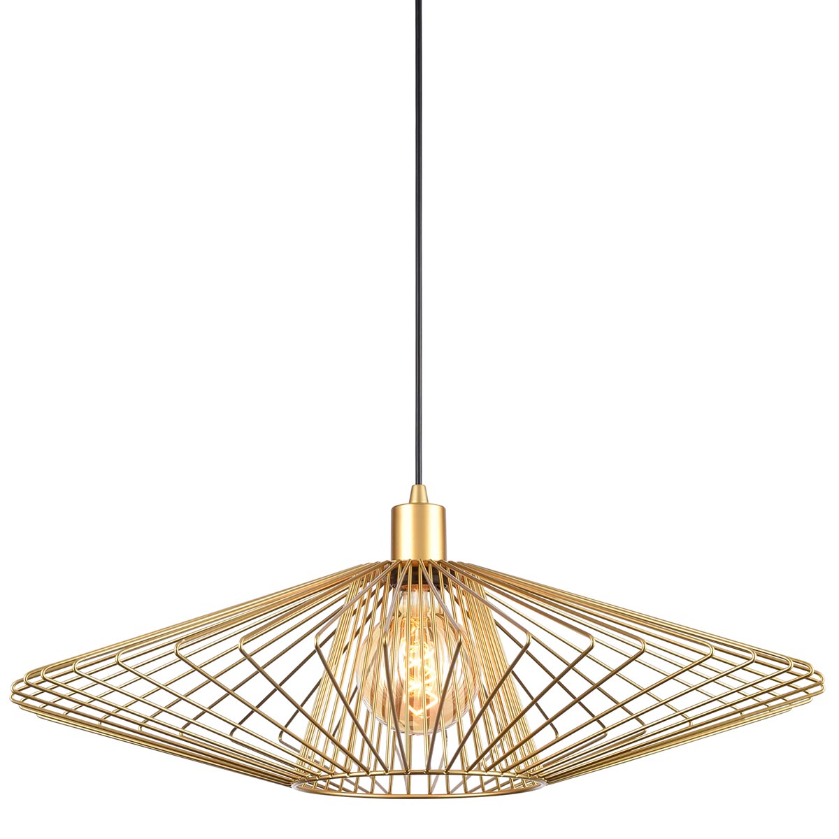 Perfect for adding modern style to your bedroom, kitchen, living or dining room, the Thatch large 1 light ceiling pendant in gold, with wire metalwork frame. Modern style meets practicality, featuring a circular ceiling mount, cable suspension and 60cm diameter wire framed diamond shaped body, with a central bare lamp bulb.