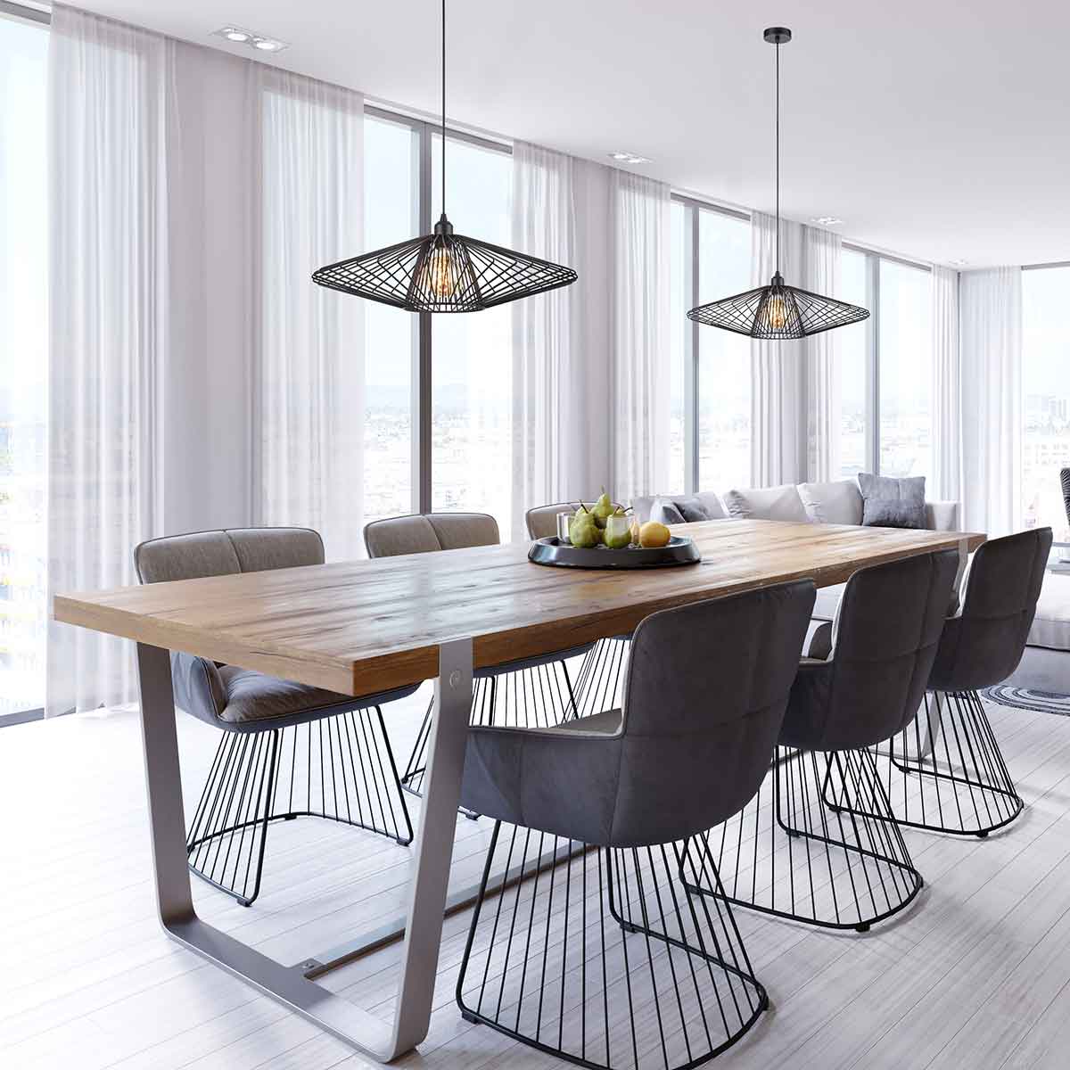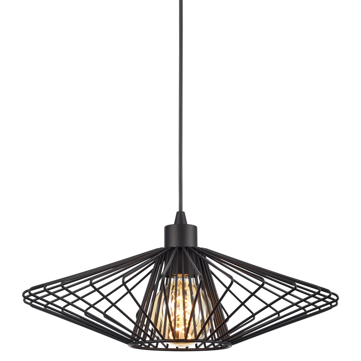 At home in both modern and traditional homes, the diamond shaped wire work, on-trend matt black finish and bare bulb give this pendant light a design edge. Height adjustable when fitting and perfect for use with a filament LED globe lamp bulb for extra impact.