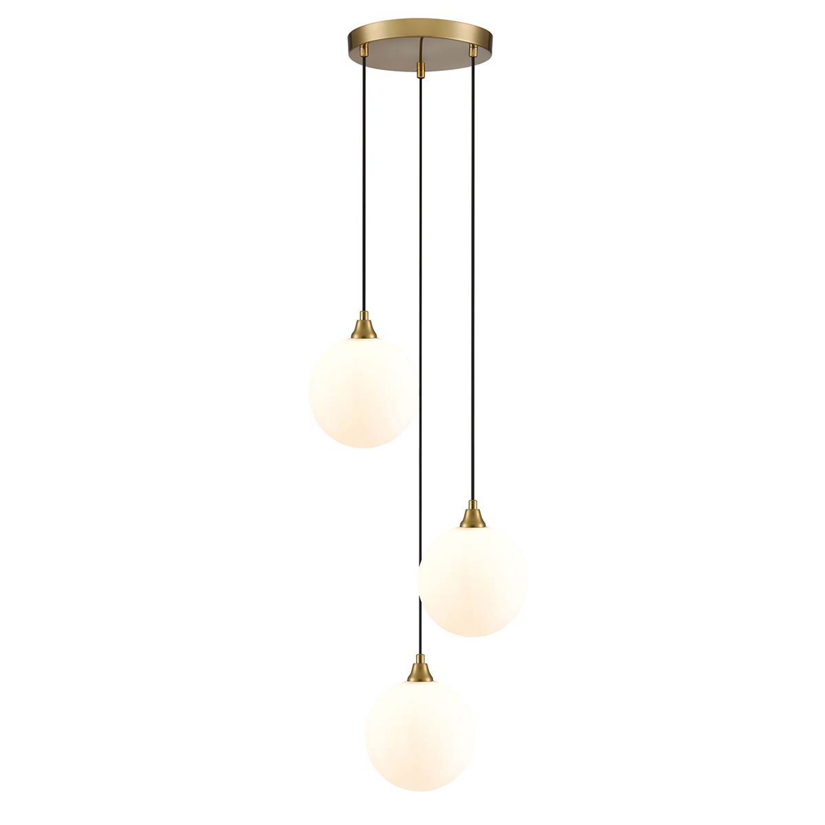 New for 2026, the Galaxy 3 light pendant with glass globe shades in aged brass from Franklite. Featuring a circular ceiling plate, with three glass globe shades attached by black cable suspension. The three cables are height adjustable when fitting, so you can get the look that suits you best. Ideal for a bedroom, living room, kitchen or hung low over a dining room table.