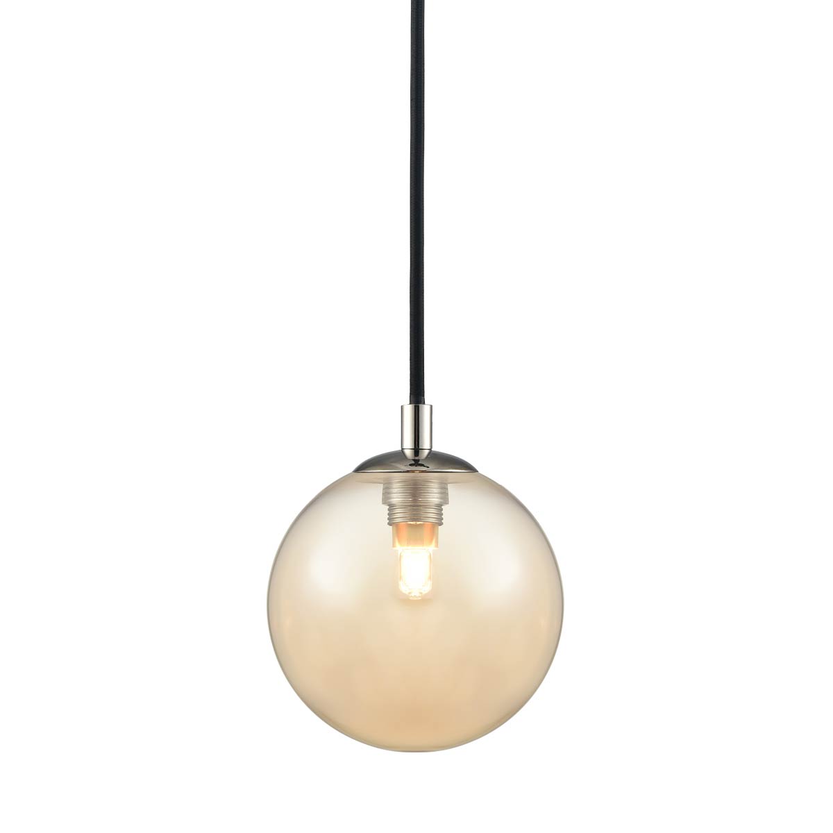 The Globe polished nickel IP44 pendant light with smooth amber glass shade from Franklite. A simple design, featuring a circular bright nickel ceiling mount and braided black cable suspension. A smooth amber glass globe shade houses the bulb, creating a lovely warm atmosphere. Height adjustable at the time of fitting and dimmable.