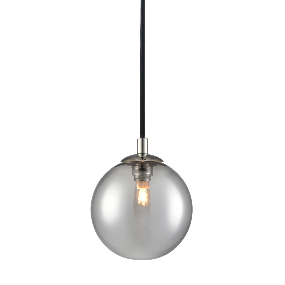 The Globe polished nickel IP44 pendant light with smooth smoked glass shade from Franklite. A simple design, featuring a circular bright nickel ceiling mount and braided black cable suspension. A smoked smooth glass globe shade houses the bulb, creating a lovely subdued twinkle. Height adjustable at the time of fitting and dimmable.