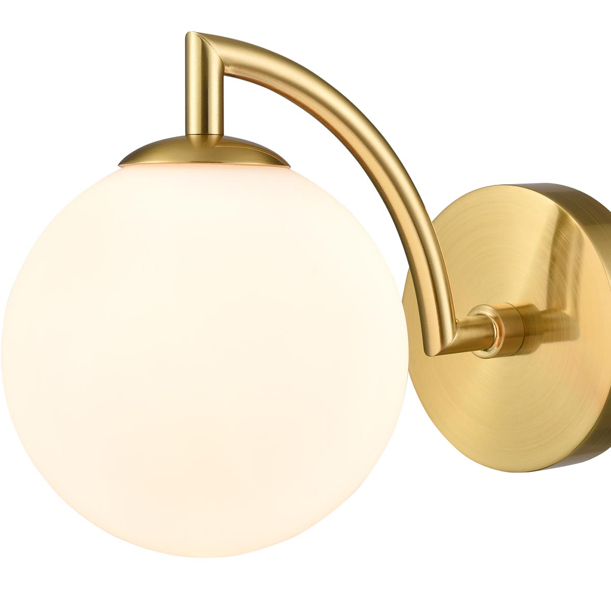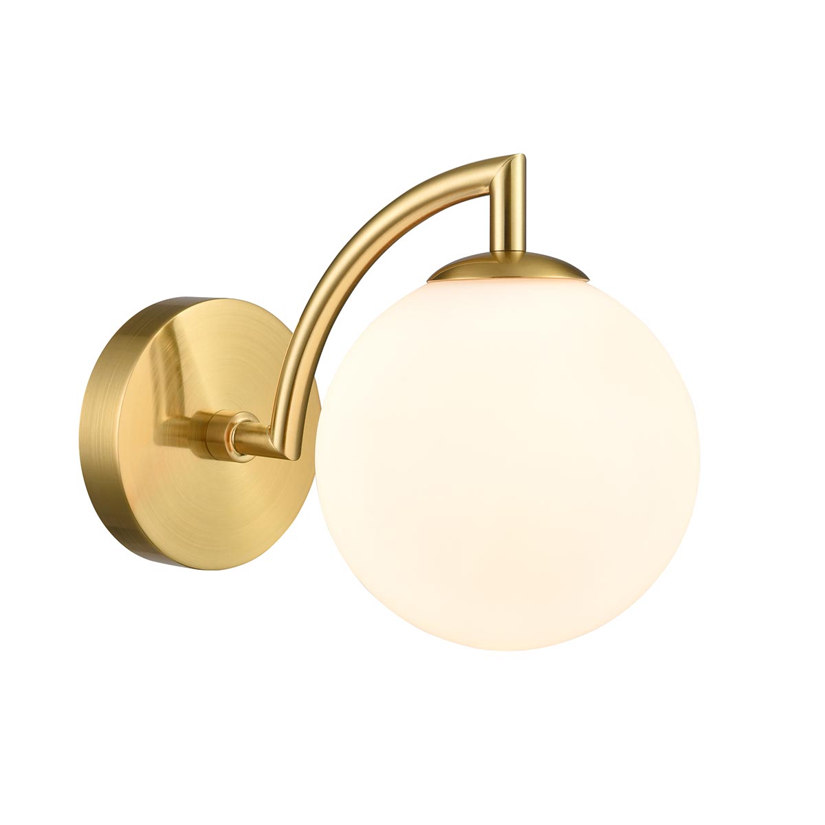 New for 2026, the Globe single bathroom wall light in aged brass with matt white opal glass shade and rated IP44 from Franklite. A modern design, featuring a circular wall mount and over arching arm in aged brass. A downward facing matt opal white glass globe shade houses the bulb, creating a lovely softened light.