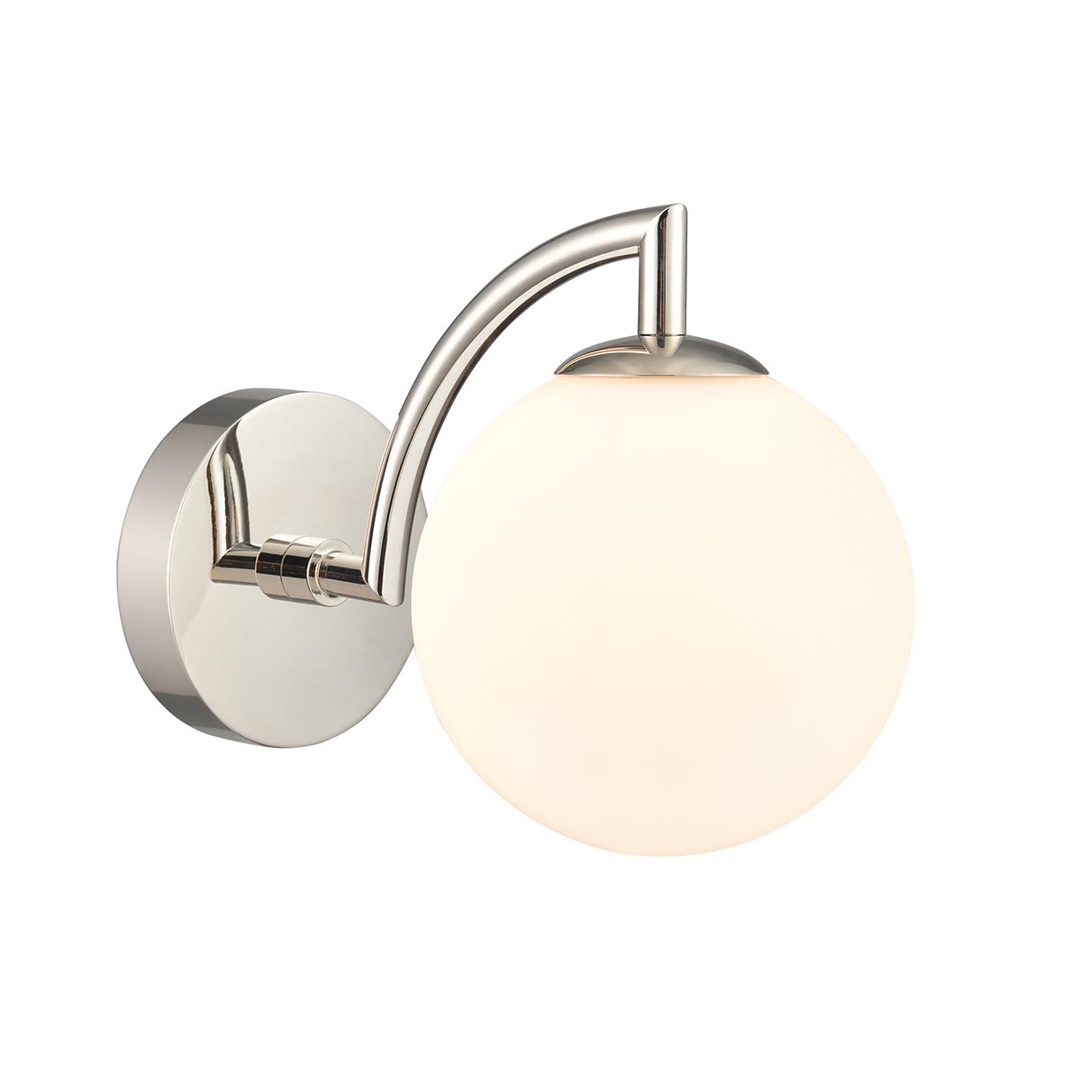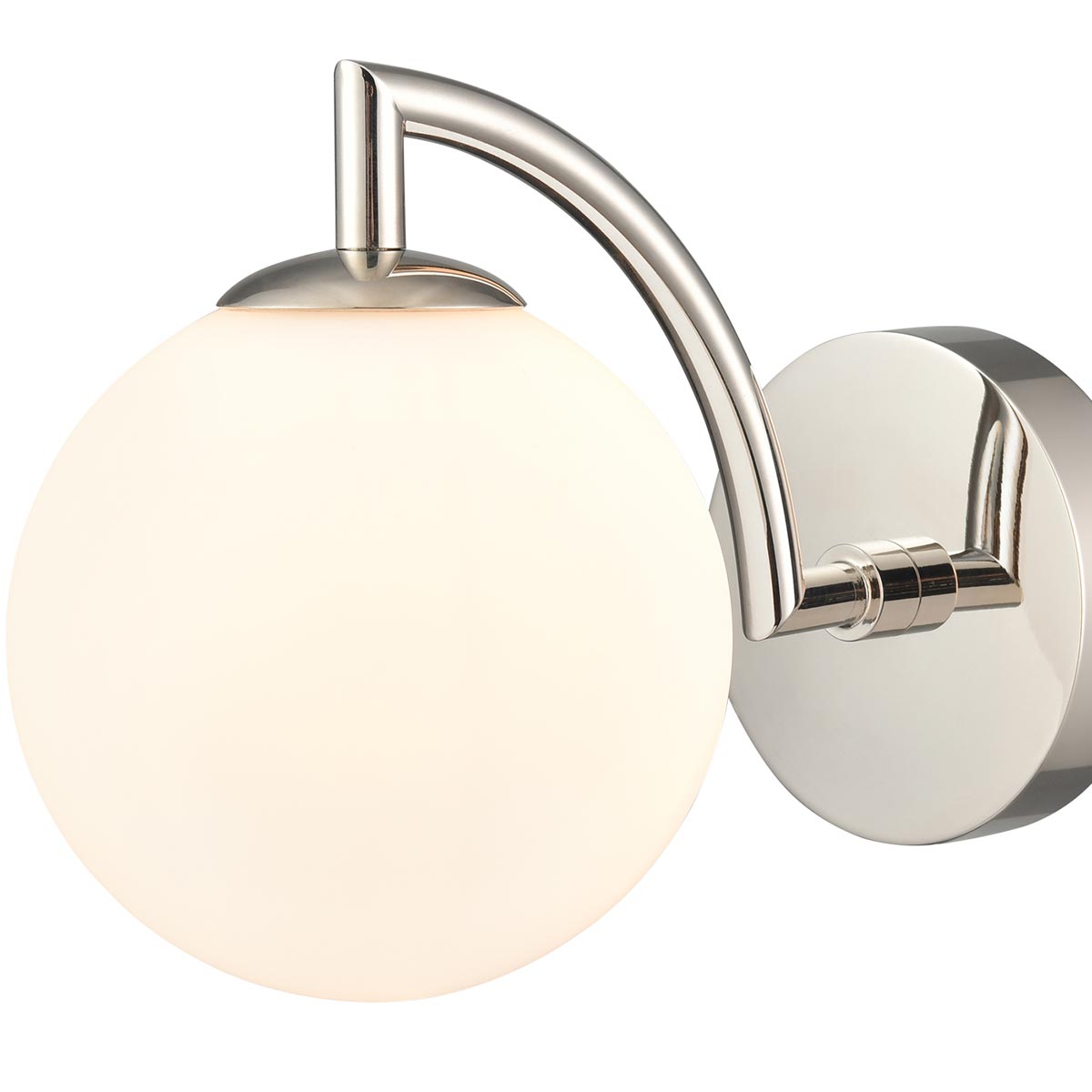 New for 2026, the Globe single polished nickel bathroom wall light with matt white opal glass globe shade and rated IP44 from Franklite. A modern design, featuring a circular wall mount and curved over arching arm in polished nickel. A downward facing opal white glass globe shade houses the bulb, creating a soft diffused light.