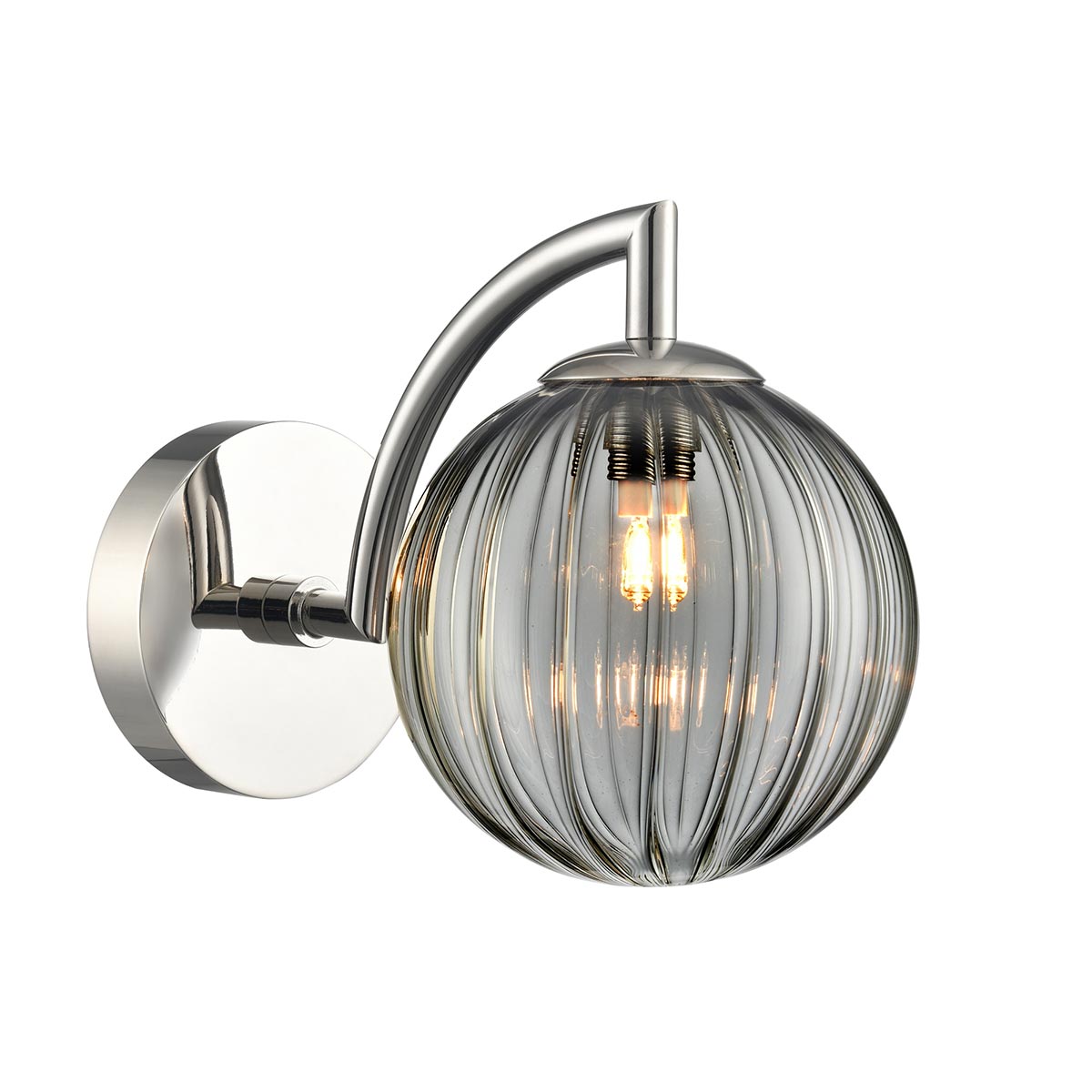 New for 2026, the Globe single polished nickel bathroom wall light with smoked ribbed glass globe shade and rated IP44 from Franklite. A modern design, featuring a circular wall mount and curved over arching arm in polished nickel. A downward facing smoked ribbed glass globe shade houses the bulb, creating a diffused twinkling light.