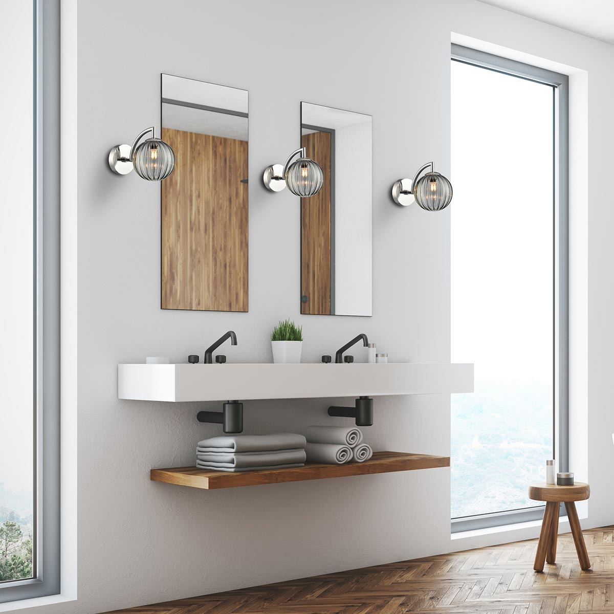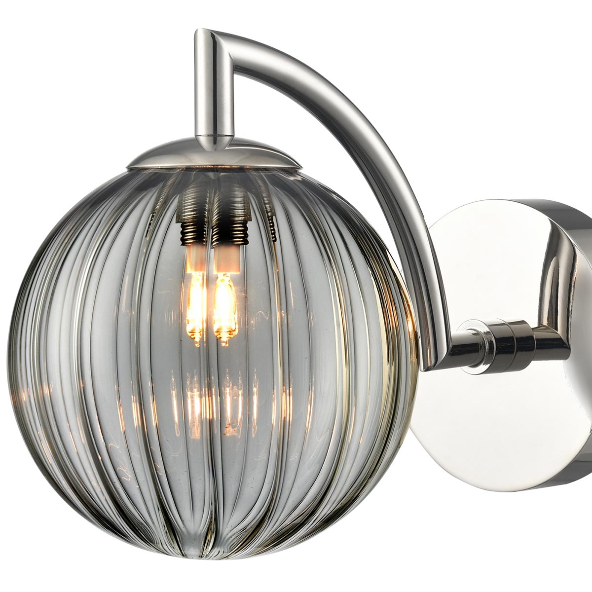 At home in both traditional and modern settings, the geometric design is modern, and the polished nickel plate matches chrome or stainless steel fittings. The smoked ribbed glass globe provides a softened light, making it ideal for any bathroom, bedroom, living or dining room.
