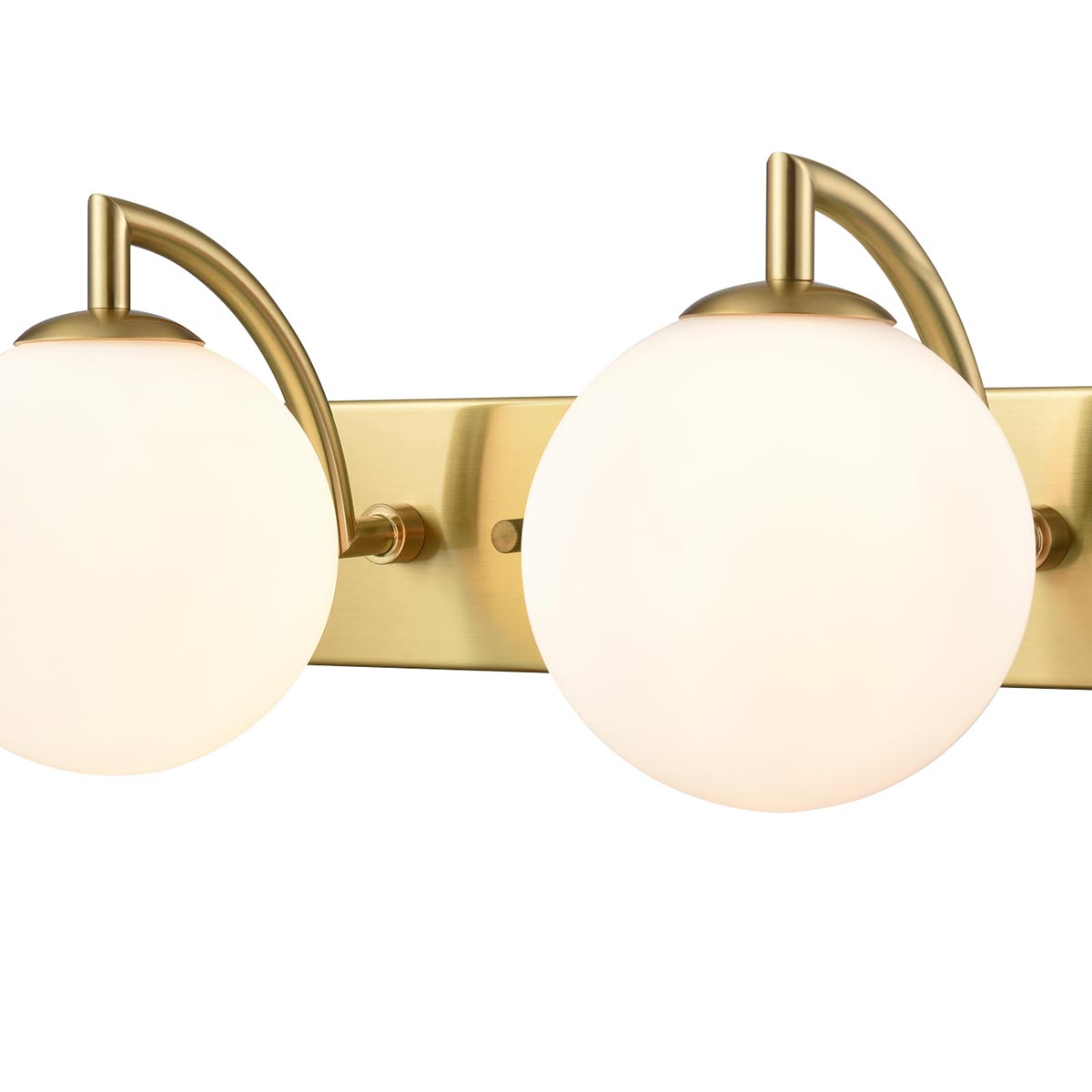New for 2026, the Globe twin aged brass bathroom wall light with matt white opal glass globe shades and rated IP44 from Franklite. A modern design, featuring a rectangular wall mount and over arching arms in aged brass. Two downward facing opal white glass globe shades house the bulbs, creating a soft diffused light.