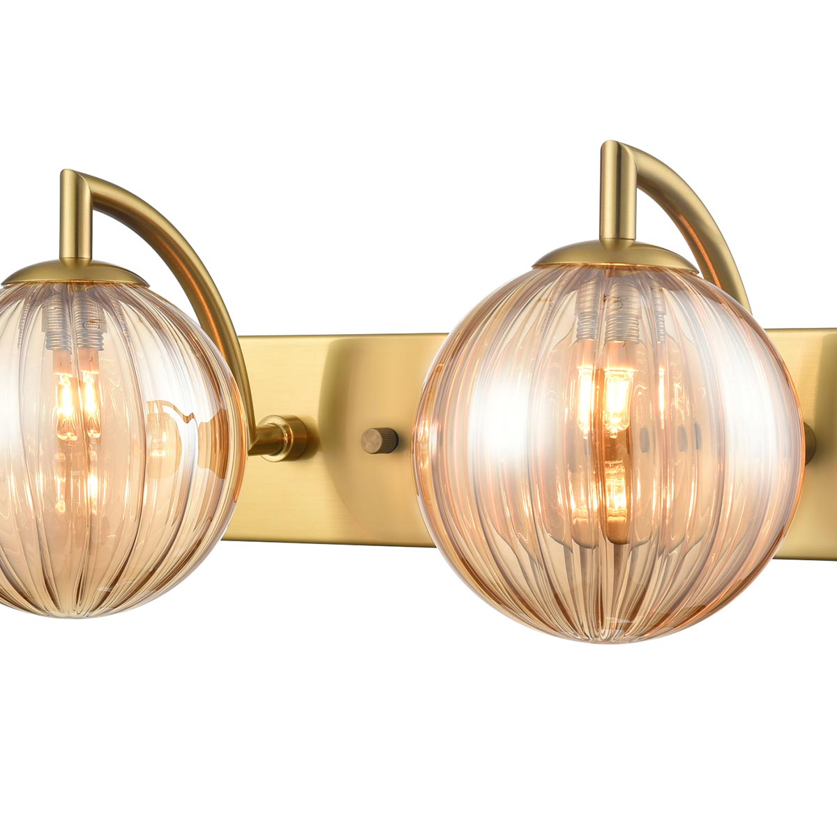 Globe Twin Bathroom Wall Light Aged Brass with Amber Ribbed Glass