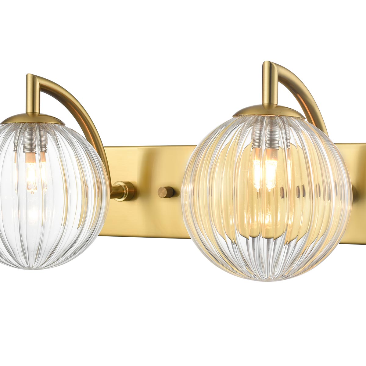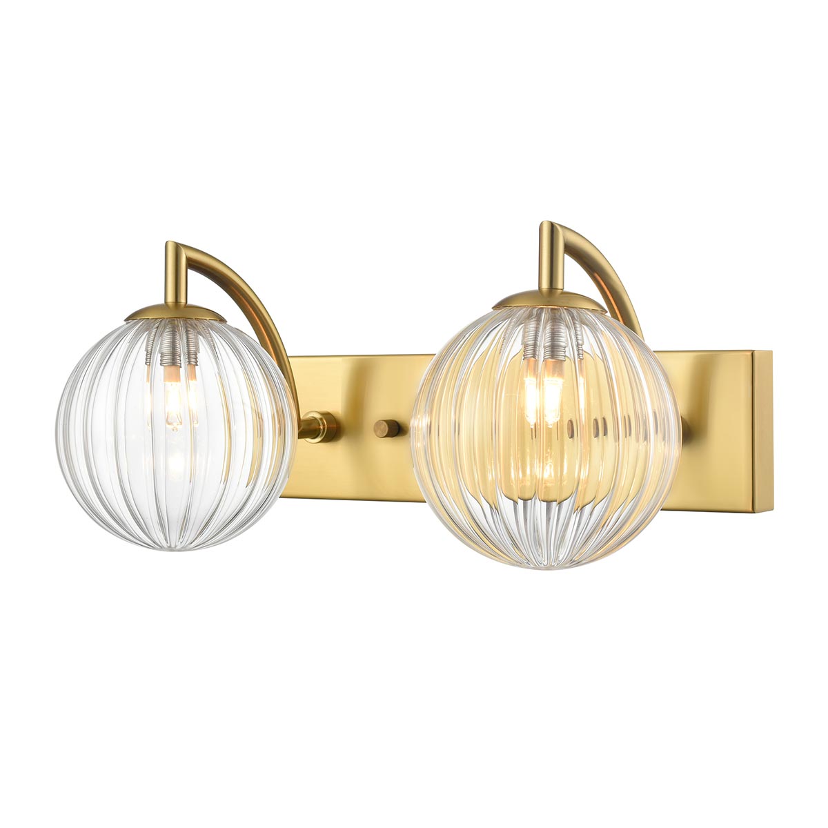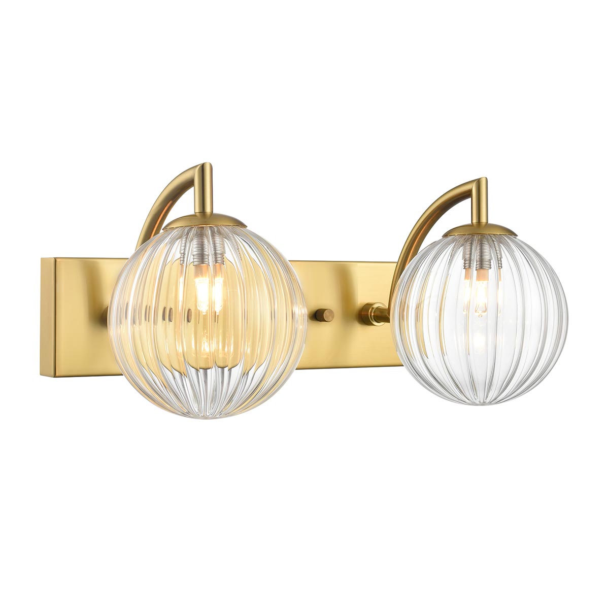Globe Twin Bathroom Wall Light Aged Brass with Clear Ribbed Glass