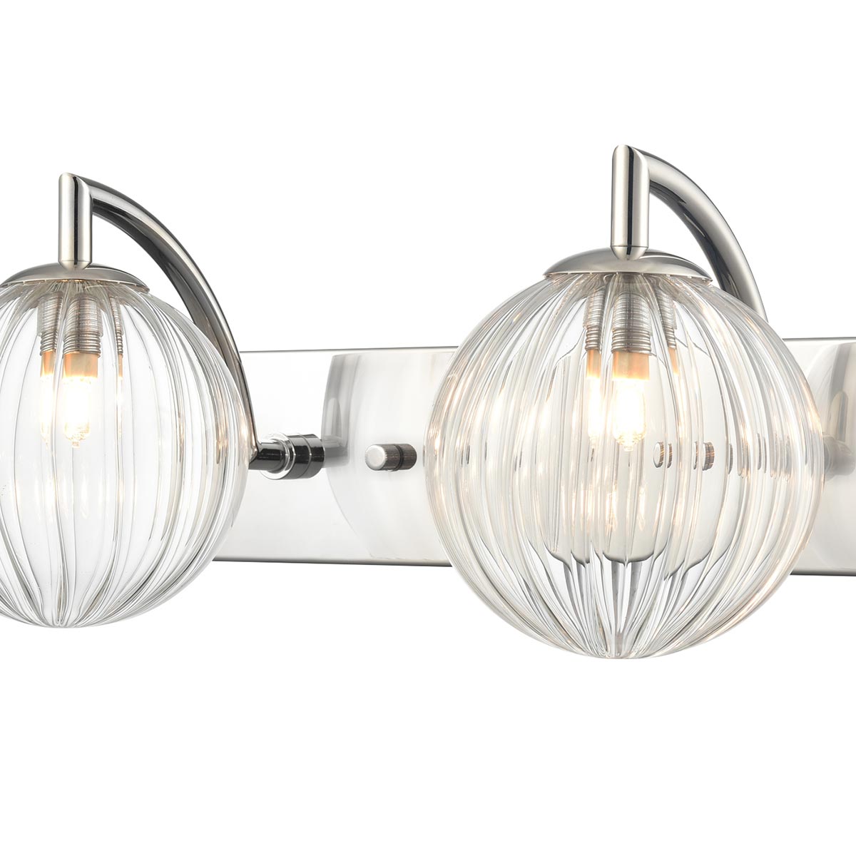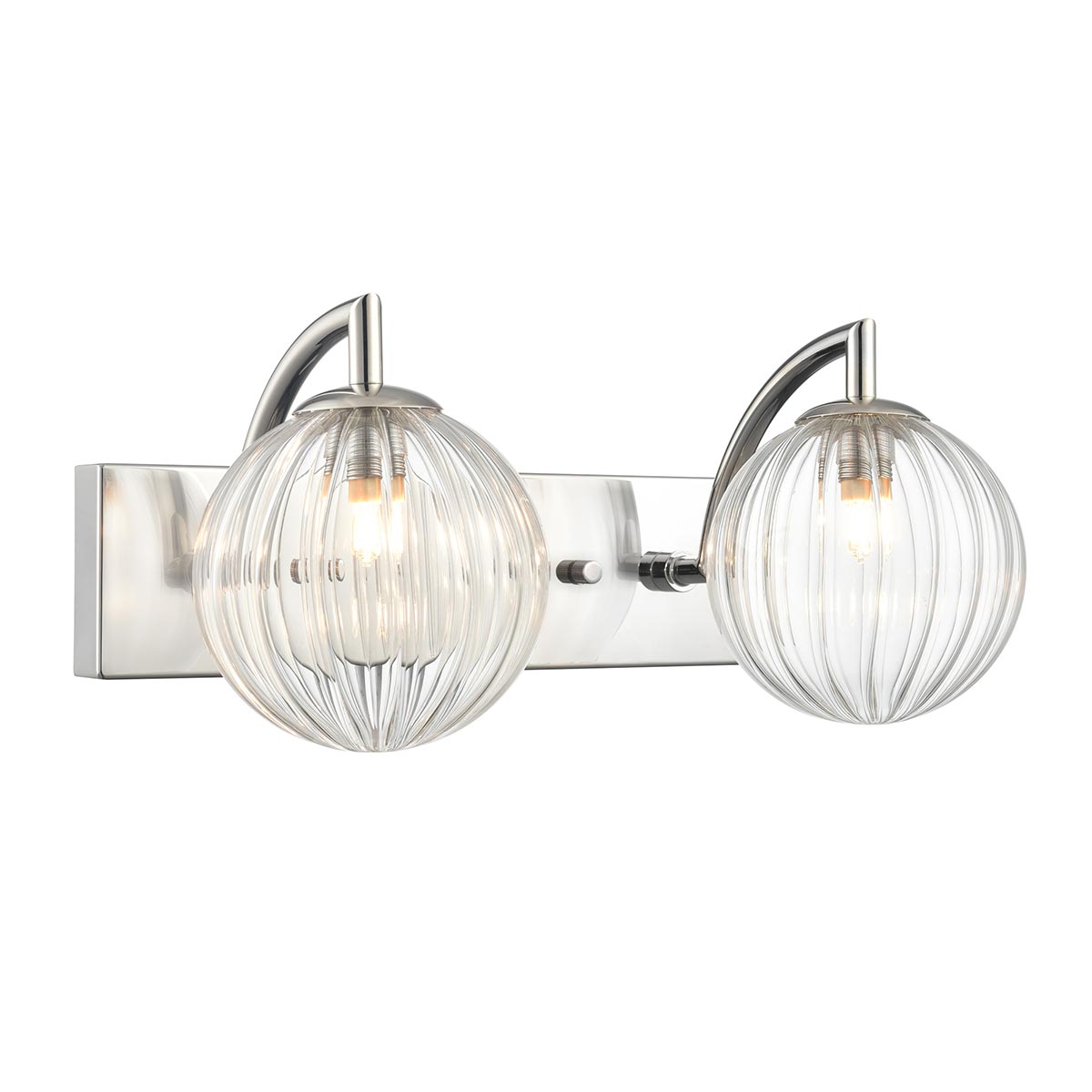 Globe Twin Polished Nickel Bathroom Wall Light With Clear Ribbed Glass