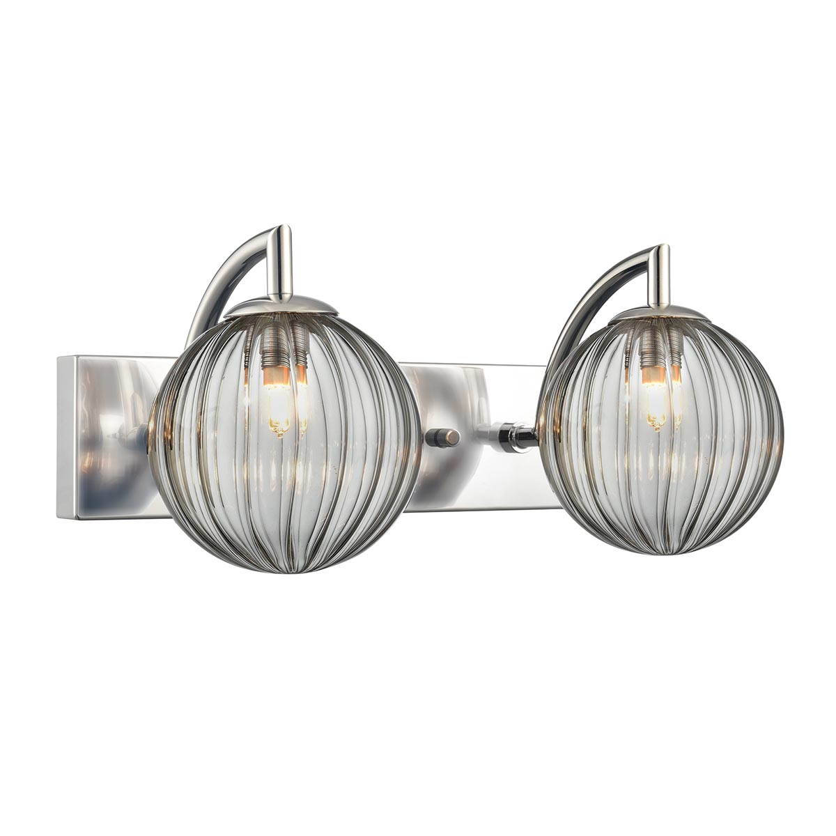 Globe Twin Polished Nickel Bathroom Wall Light With Smoked Ribbed Glass