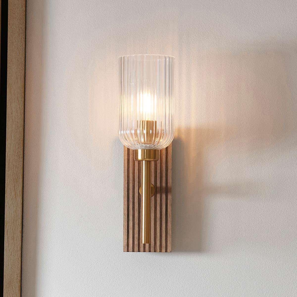 The Grove single wall light in vintage brass with clear ribbed glass goblet shade blends warm natural materials with refined detailing. Featuring a tall ridged beechwood rectangular wall mount, straight arm and upward facing clear ribbed glass goblet shade that twinkles when lit. Supplied unswitched and dimmable when paired with suitable bulbs.