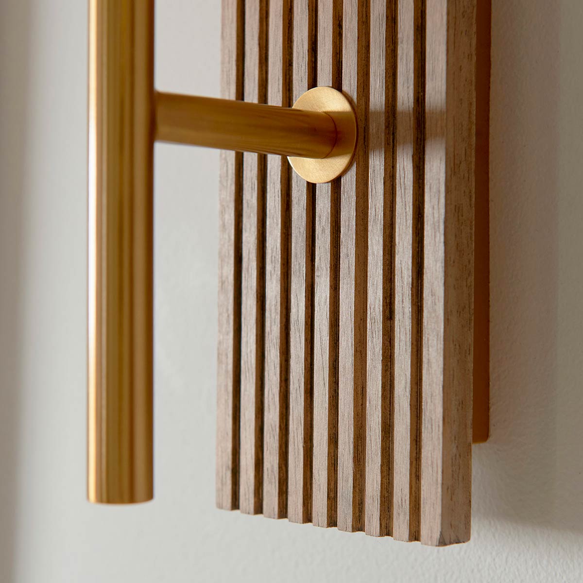 The grooved walnut-stained wooden backplate adds rich natural character, making it an ideal complement to interior spaces with wooden accents. It offers a harmonious mix of modern design and organic warmth, making it ideal for a bedroom, kitchen, living or dining room wall.