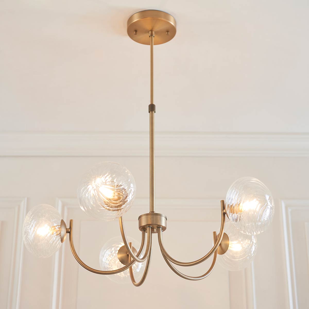 The Hague 5 light chandelier in antique brass with twisted clear glass shades and updated classic style. Featuring a circular ceiling mount, telescopic rod suspension and 65cm diameter body, with five graceful curved upturned arms. Each arm features a twisted clear glass globe shade that creates a wonderful twinkling light.