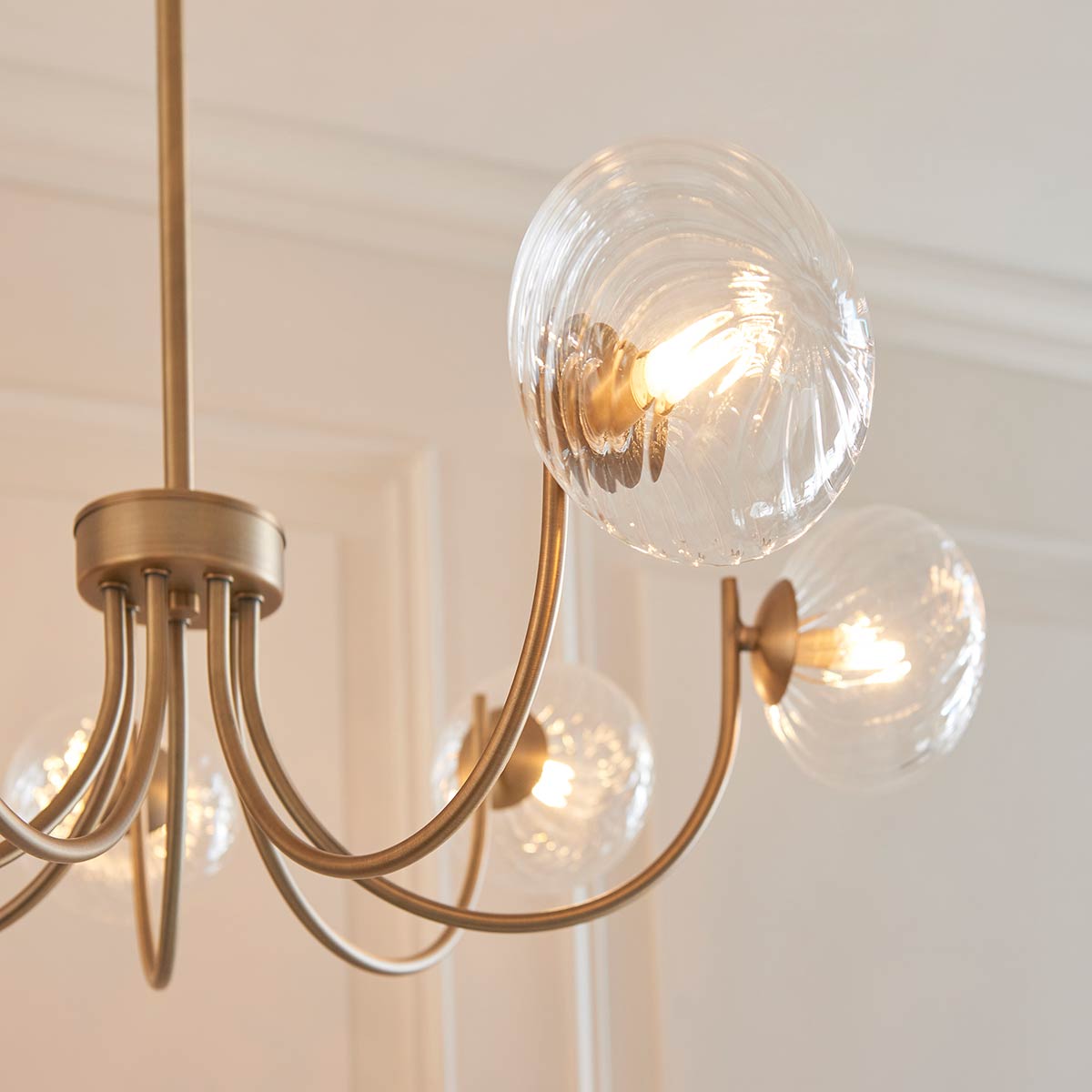 Finished with beautiful glass shades and fully dimmable, this timeless chandelier combines traditional style with modern aesthetics. The flawless antique brass plated metalwork bring warmth into the room and the twisted glass shades make the light shimmer. Ideal for living rooms, hallways or over dining room tables.