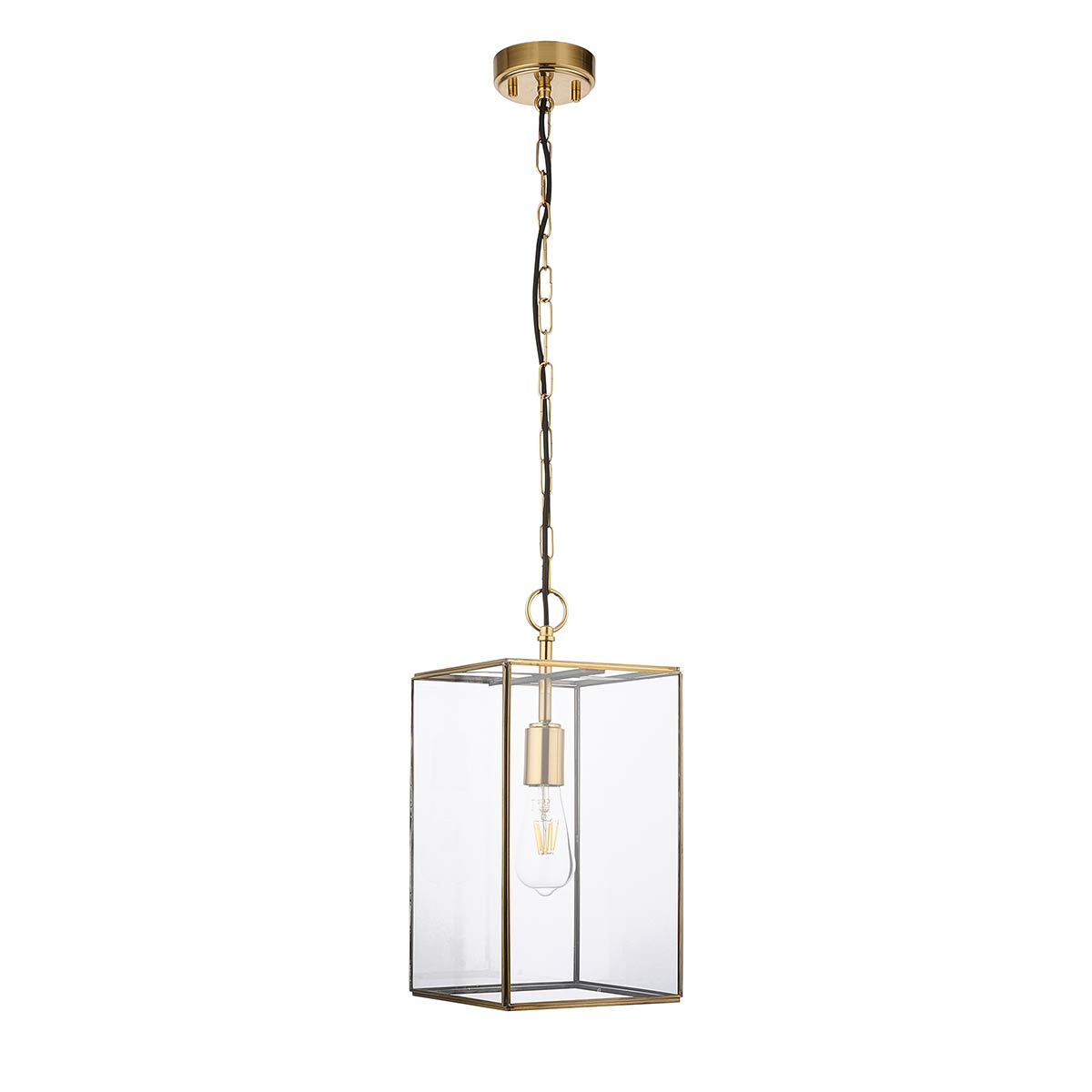 The Endon Hammond Grand hanging box lantern in antique brass with clear glass panels is a modern classic. Featuring a 21.5cm square box lantern, with chain suspension attached to a circular antique brass plated ceiling mount. Fitted with clear glass panels and a top mounted bulb holder, this lantern is perfect for a small hallway or vestibule.