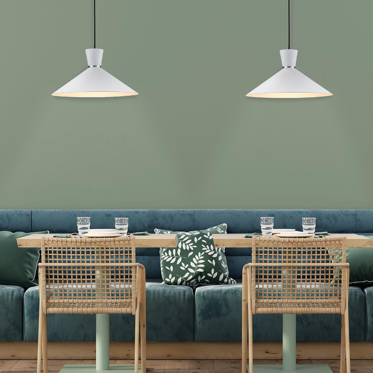 The Happy 1 light large metal coolie pendant in satin white from Franklite is classic and contemporary. Featuring on trend updated industrial style, with a circular ceiling mount, black braided cable suspension and large 40cm diameter coolie shade containing a single bulb. The shade inner is also white to reflect light downwards, making it ideal for over a dining room table.
