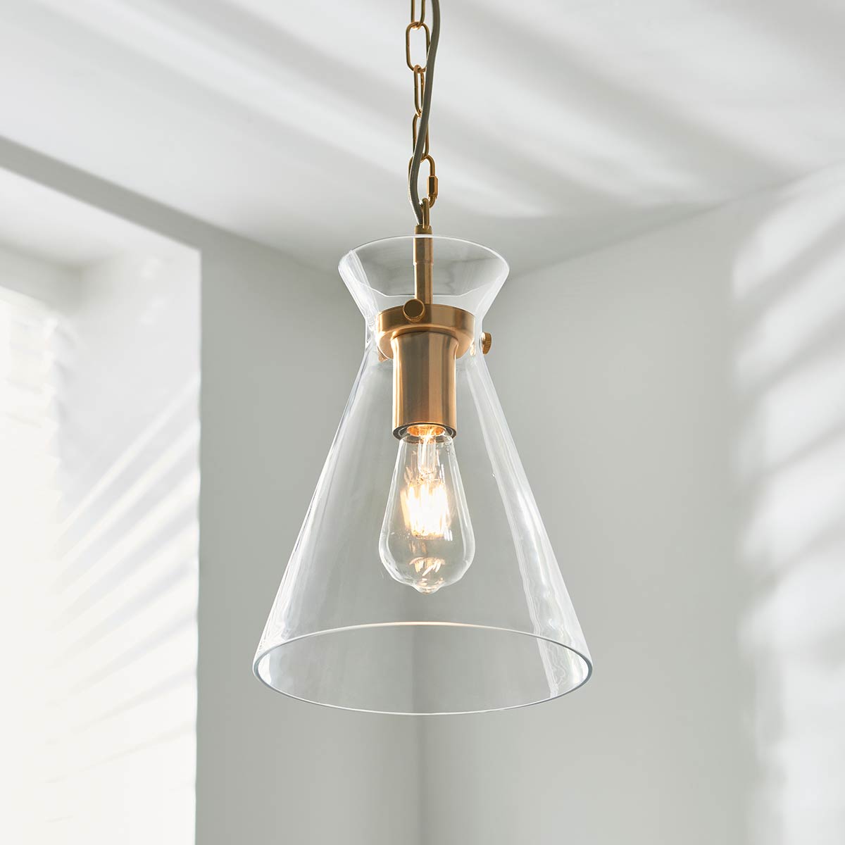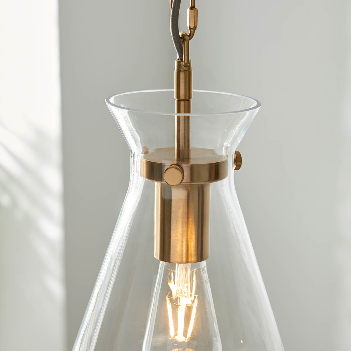 Featuring a circular ceiling mount, chain suspension and detailed shade mount and lamp holder plated in brushed aged brass. A 33.5cm diameter clear glass shade houses the single bulb for bright all round light. Perfect for installing singly over tables or in a row over a breakfast bar.