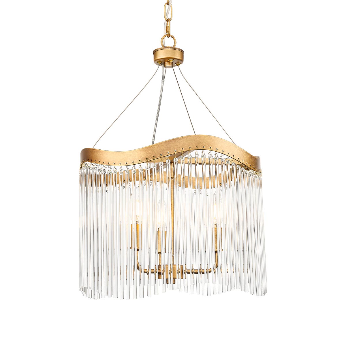 The Harp small 3 light aged brass pendant chandelier with clear glass rods by Franklite is beautiful and contemporary. Featuring a circular ceiling mount, chain suspension and fine wires supporting a small, deep curved frame finished in aged brass. A three light candelabra hangs inside, with clear glass rods hanging outside at different levels, creating a wavy effect.