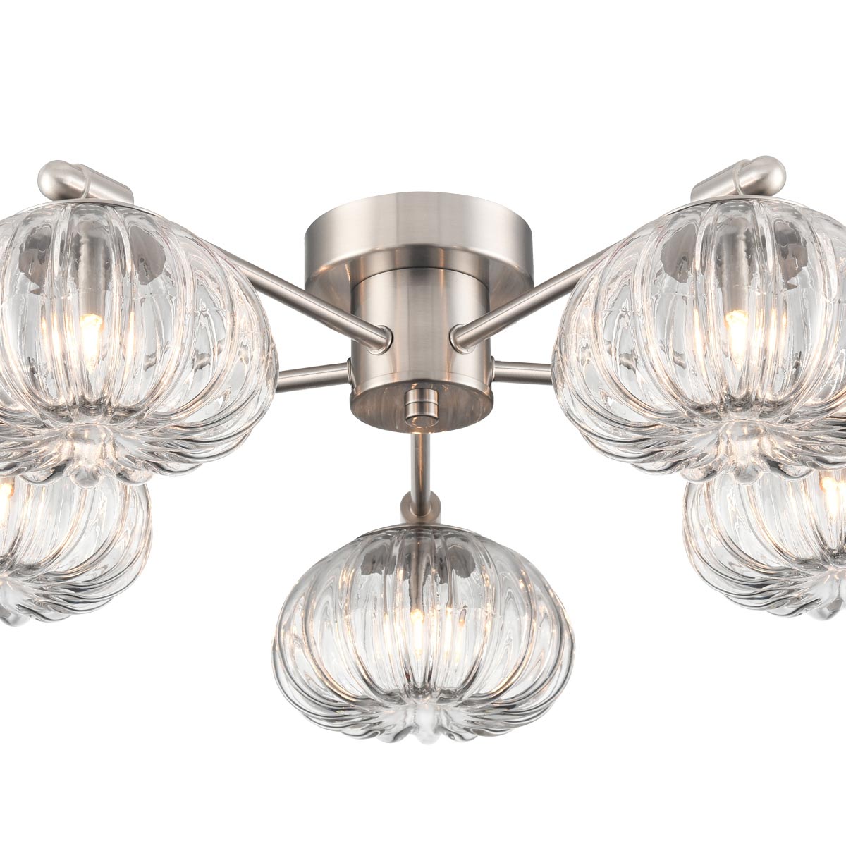 Traditional and stylish, the Harvest 5 light ribbed glass flush fitting in satin nickel from Franklite is ideal for any room with a low ceiling. Featuring a circular ceiling mount, with five spoke arms and downward facing ribbed clear glass shades. The ribbed glass diffuses the light beautifully, and the flawless satin nickel finish is timeless.