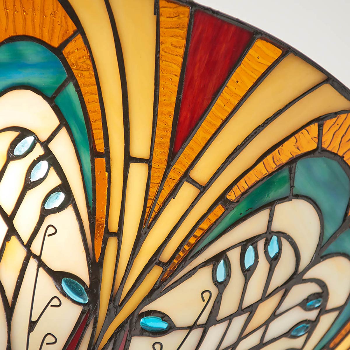 The Hector medium Art Nouveau 3 light inverted Tiffany pendant with exciting vibrant design is handcrafted from quality art glass, with each piece inlaid and hand soldered using traditional leaded glass techniques. A 40cm diameter uplighter shade features vibrant blues, reds and sparkling golden amber laid over a neutral cream base colour.