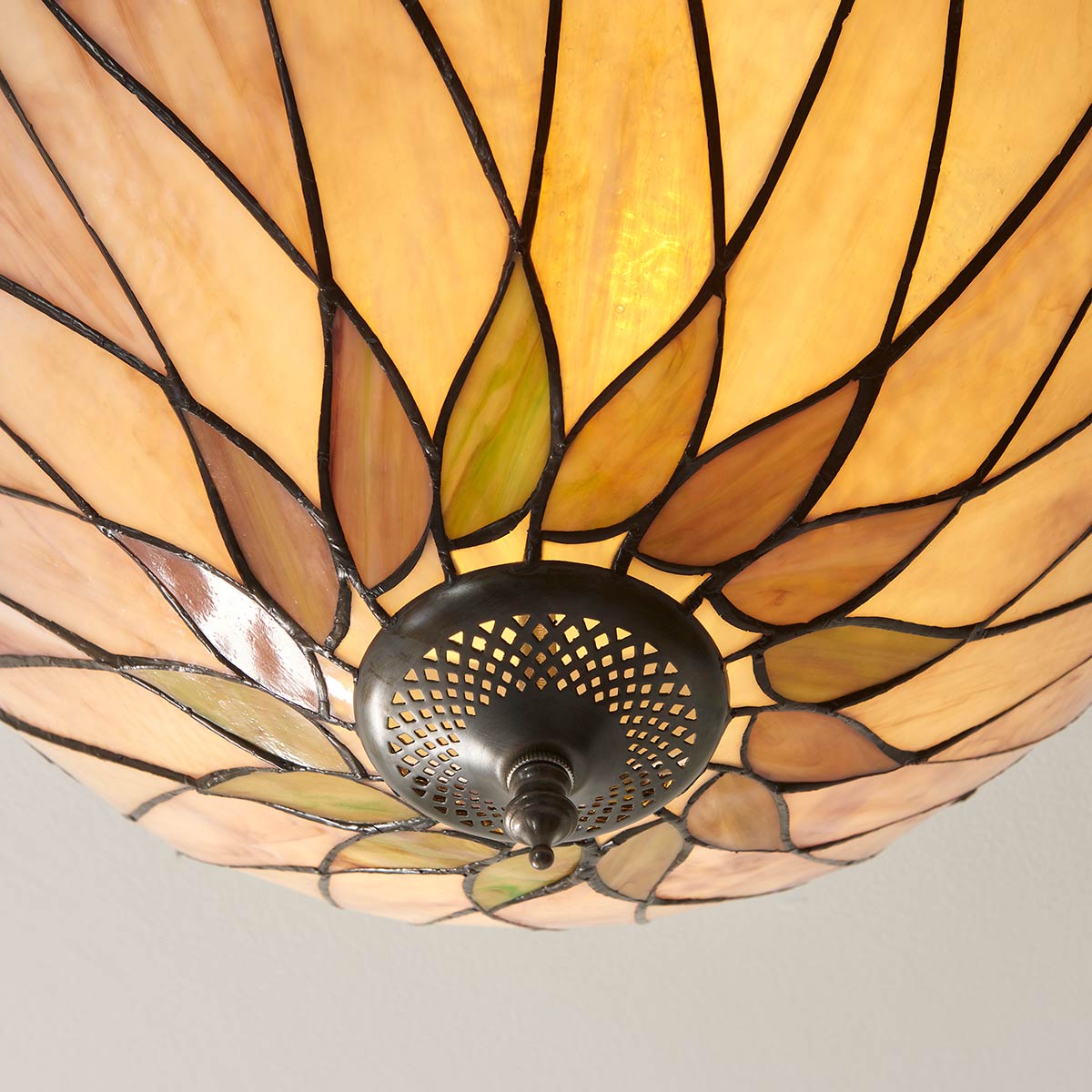 The Hutchinson medium flush Tiffany ceiling light is handcrafted, and the colours may vary slightly from the images shown, as each piece of glass is hand-made and may differ slightly in colour or shade. This should not be seen as a fault, rather something that makes each Tiffany shade unique.