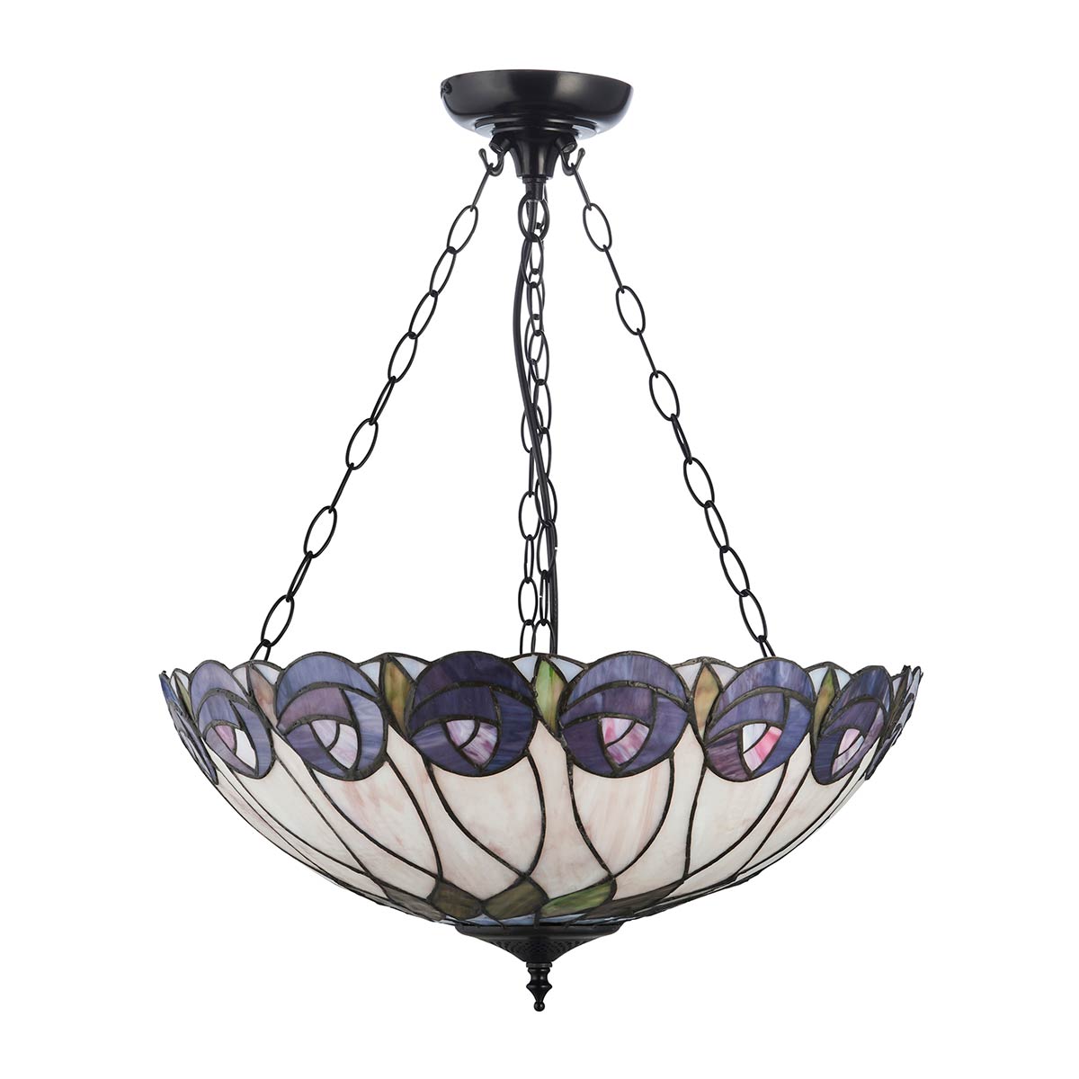 The Hutchinson 3 light large inverted Tiffany pendant with a Mackintosh rose design is handcrafted from quality art glass, with each piece inlaid and hand soldered using traditional leaded glass techniques. A 50cm diameter uplighter shade features a creamy white background and a Mackintosh rose in shades of purple, lilac and mauve inlaid around the rim, with olive green leaves.