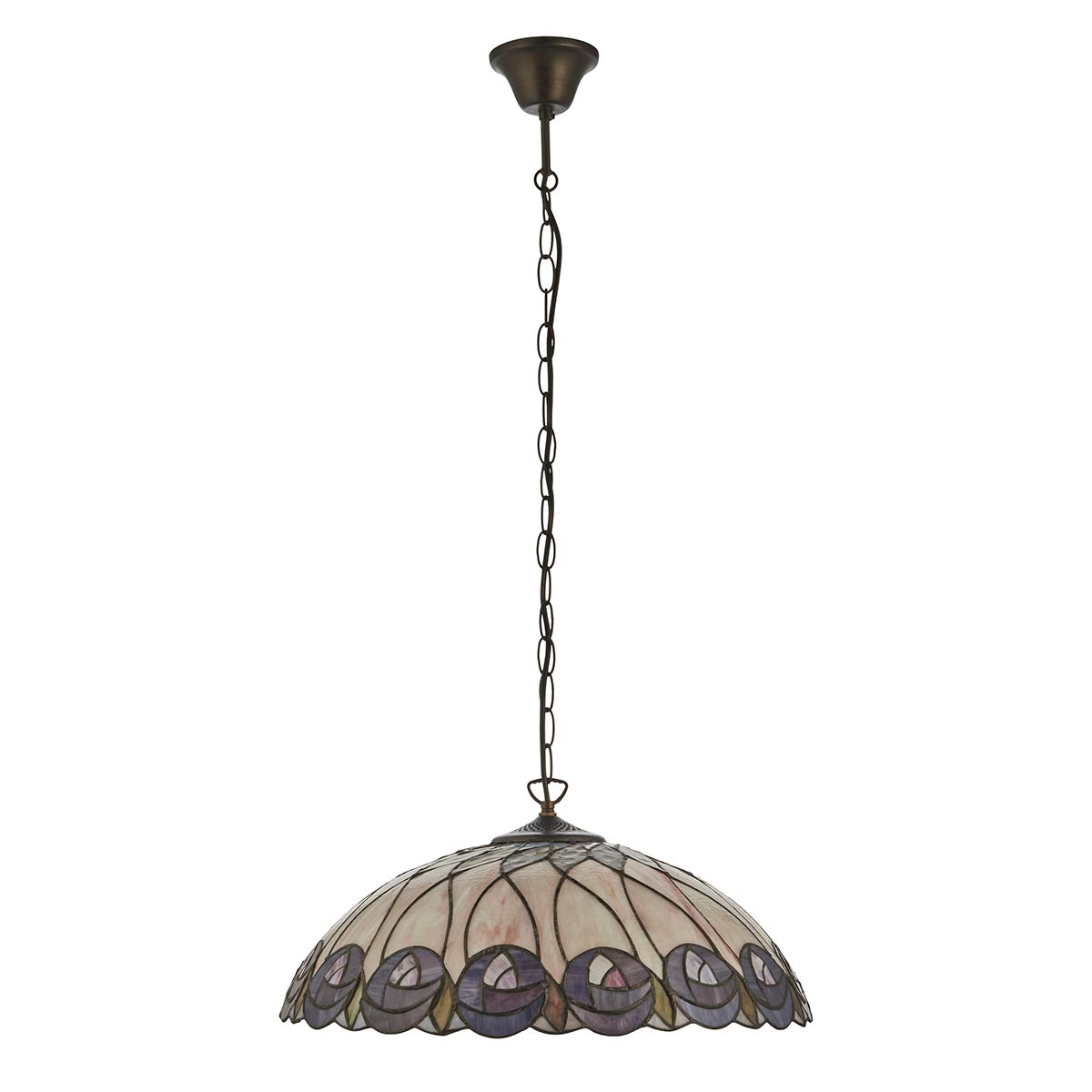 The Hutchinson 3 light large Tiffany ceiling pendant with a Mackintosh rose design is handcrafted from quality art glass, with each piece inlaid and hand soldered using traditional leaded glass techniques. A 50cm diameter shade features a creamy white background and a Mackintosh style rose in shades of purple, lilac and mauve inlaid around the rim, with inlaid olive green leaves.