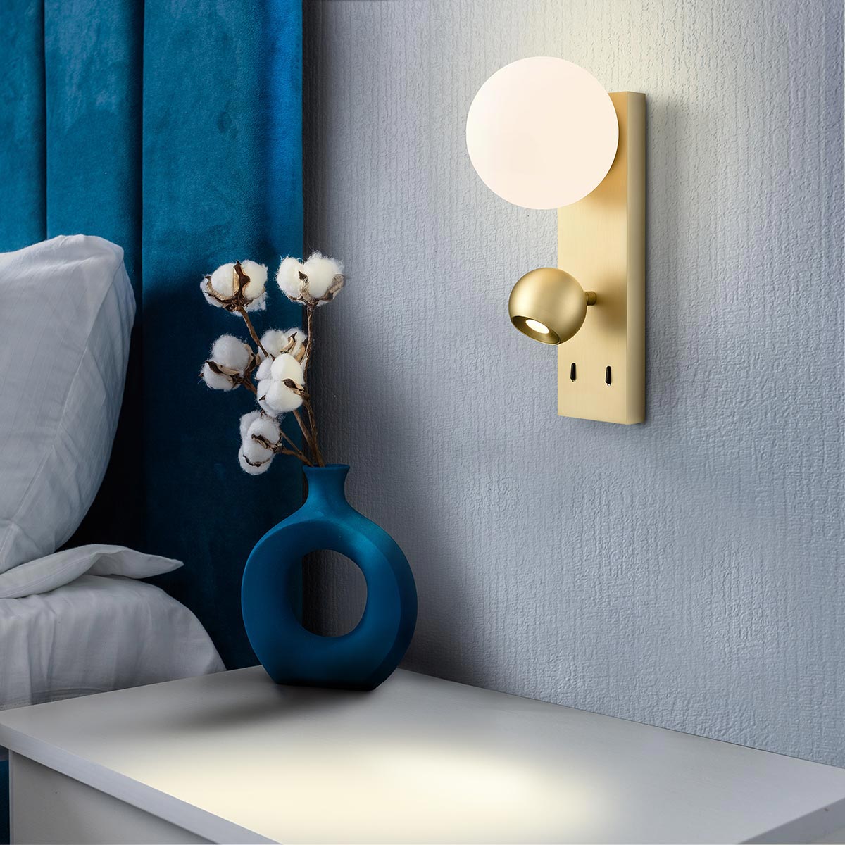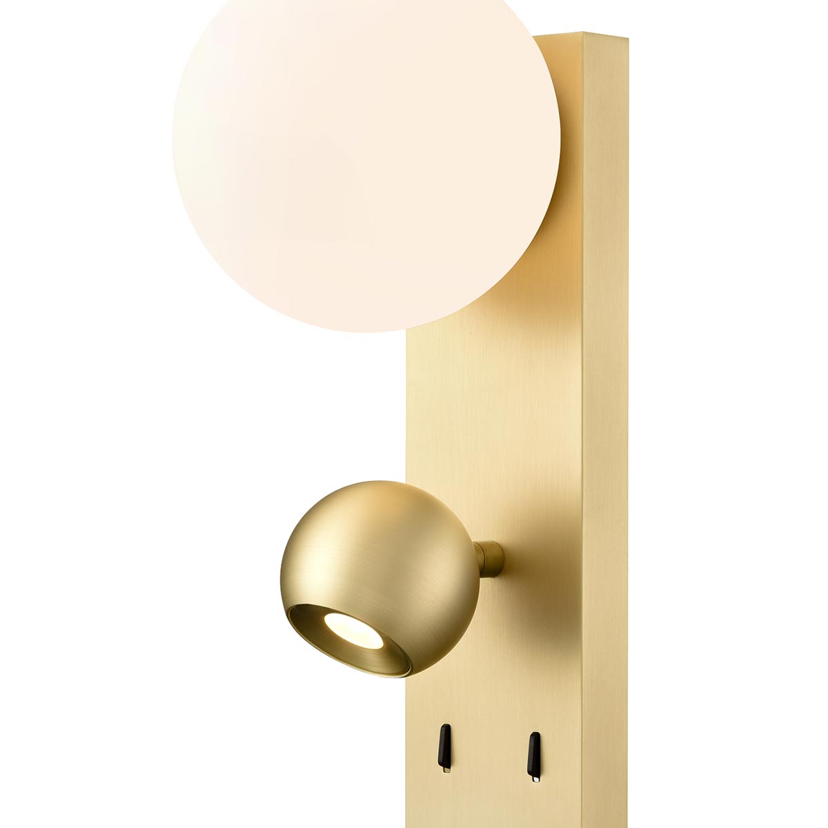 The Iris modern 2 light LED satin brass wall reading light with adjustable spotlight and opal glass shade from Franklite is contemporary and bright. Featuring a tall rectangular satin brass wall mount, with an opal white globe at the top and a fully adjustable ball spotlight below. The wall plate is fitted with two independent rocker switches, so you can use each light individually.