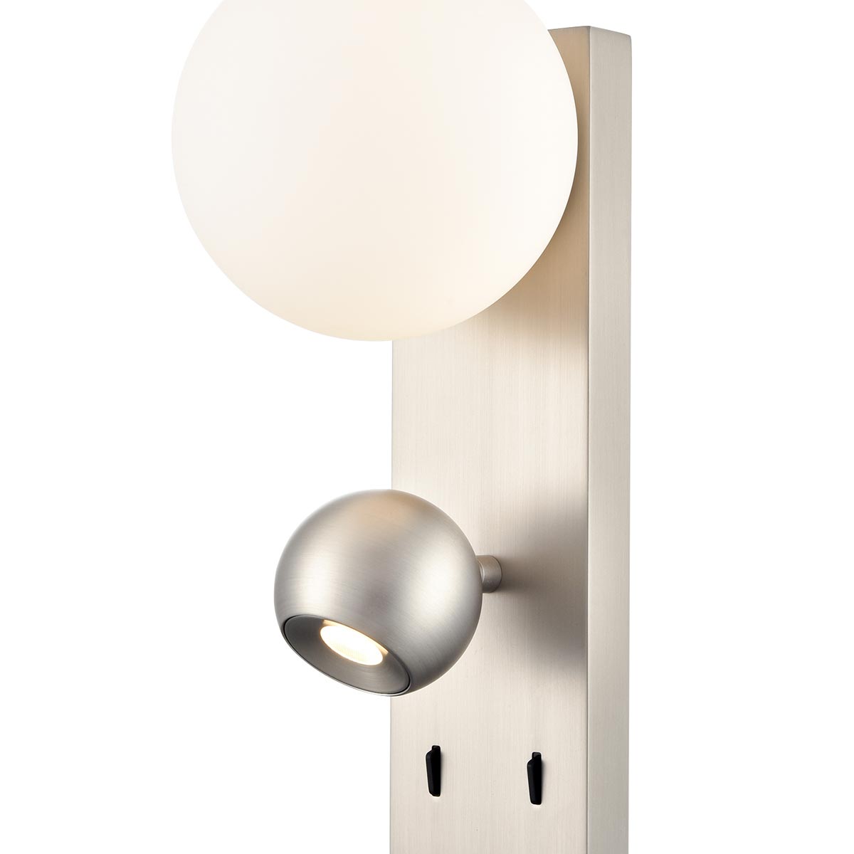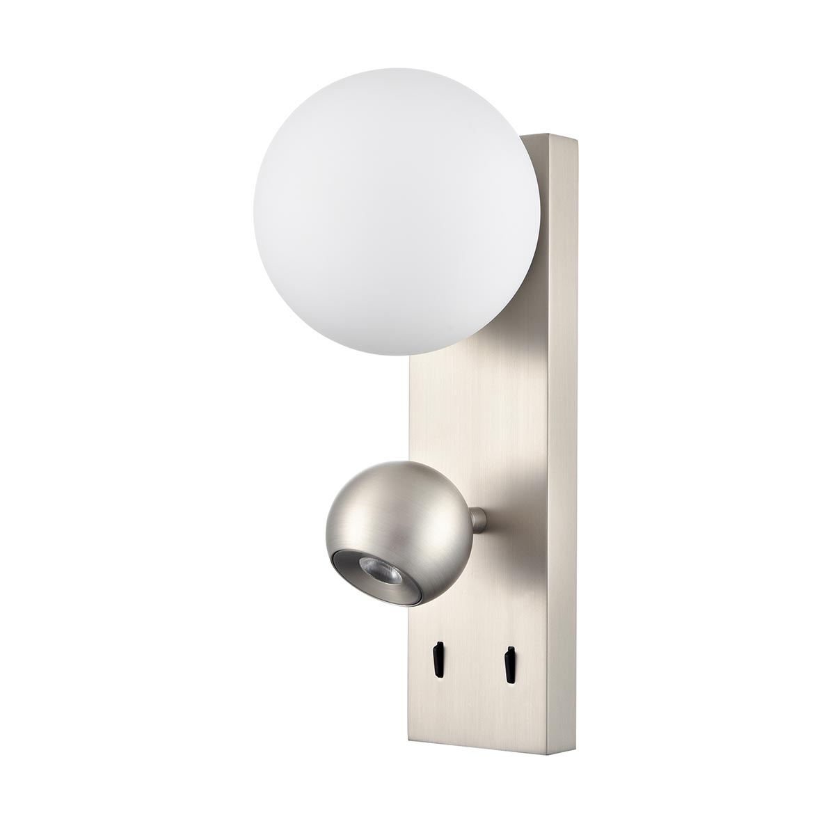 The Iris modern 2 light LED wall reading light with adjustable spotlight and opal glass shade in satin nickel from Franklite is contemporary and bright. Featuring a tall rectangular satin nickel wall mount, with an opal white globe at the top and a fully adjustable ball spotlight below. The wall plate is fitted with two independent rocker switches, so you can use each light individually.