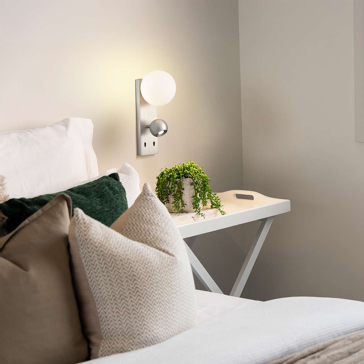 This satin nickel finish wall reading light features warm white LEDs in the main light, producing 510 lumens, surrounded by an opal glass shade that softens the light beautifully. The fully adjustable ball spotlight is fitted with warm white LEDs that provide 485 lumens of directional light to help with reading or any other task.