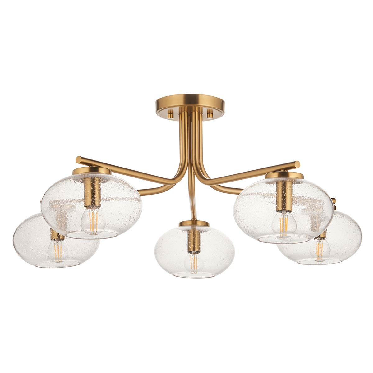 The Jacob 5 light semi flush in aged brass with bubble glass shades features classic curves and modern simplicity. Boasting softly curved arms in warm brass and handmade clear bubbled glass shades. Each shade distorts the light subtly and creates a gentle sparkle that adds atmosphere to any room. Suitable for rooms with a low ceiling.