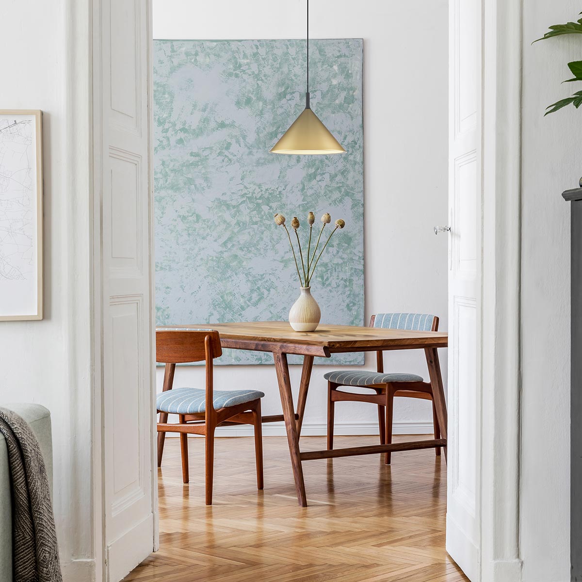 We love this Joy ceiling pendant, with warm satin brass metalwork and contrasting black cable. The cone-shaped shade is sleek and modern, creating a contemporary look, and the larger diameter spills the light further out. Height adjustable when fitting and dimmable when paired with a suitable bulb.
