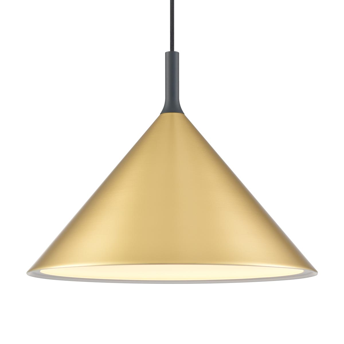 Sleek and stylish, the Joy large single light metal pendant in satin brass finish from Franklite is ideal for over a breakfast bar or dining table. Featuring a circular ceiling mount, braided black suspension and 400mm diameter metal cone shade in satin brass. All the light from the bulb is directed downwards, making it ideal for over your bed, a kitchen or dining room table.