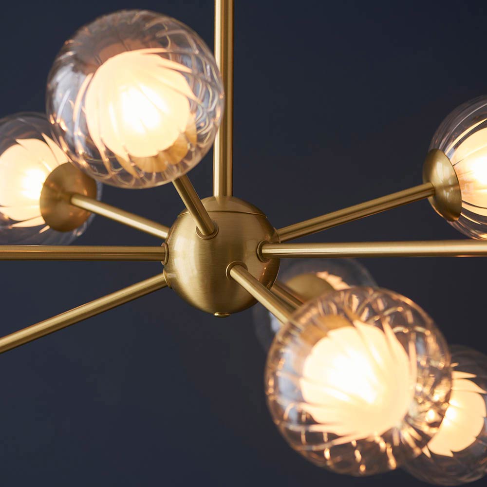 Create a dramatic look in any room with this large 9 light pendant ceiling light in satin brass with ribbed and frosted glass shades. Featuring modern industrial style, with a circular ceiling mount, telescopic drop rod and central Sputnik ball. Nick straight arms radiate from the ball, with beautiful clear ribbed glass globes and frosted glass inner shades.