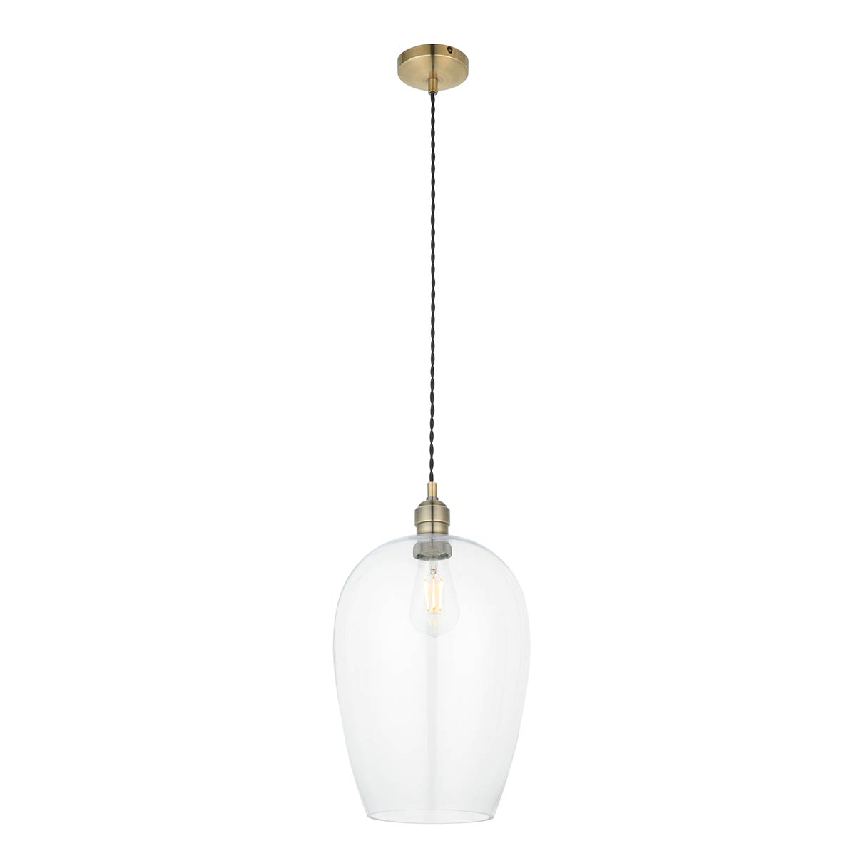Featuring a circular ceiling mount, twisted cable suspension and antique brass shade mount and lamp holder with knurled detail. The large clear glass shade allows maximum light through, making it ideal for kitchens, living and dining areas, hallways and bedrooms. Perfect for use over dining tables, a breakfast bar or kitchen island.