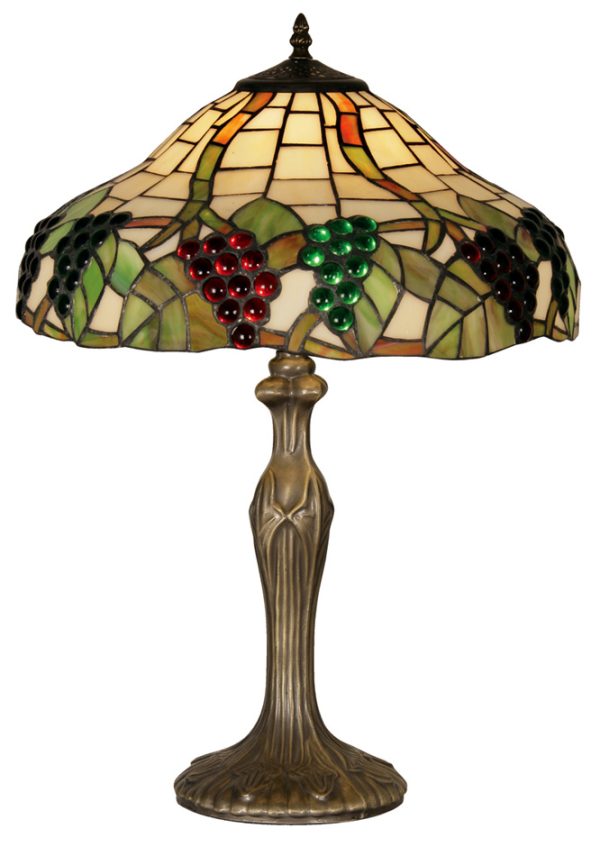 This large Grape Vine Tiffany table lamp design incorporates two different coloured vines standing proud of the individual mottled green foliage.
