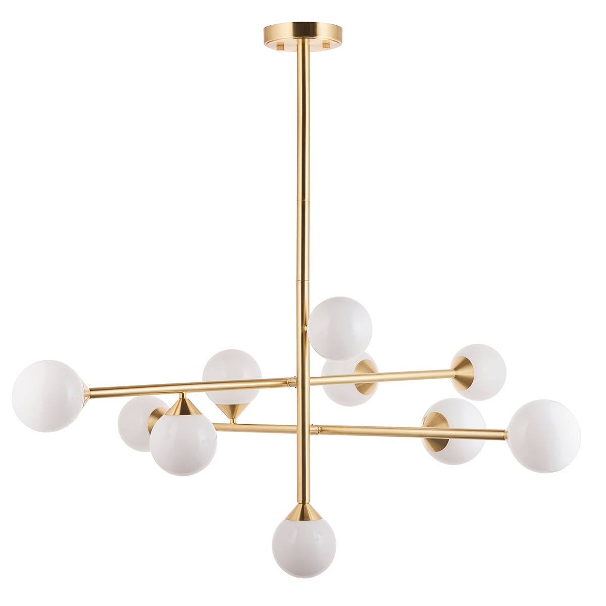 Create a statement with this large modern 10 light pendant in satin brass with opal glass shades. Featuring an angular geometric silhouette, circular ceiling mount, sectional drop rod two crisscross arms creating a 117cm diameter display. Ten gloss opal white glass sphere shades house the bulbs and radiate at different angles, creating a wonderful diffused light.
