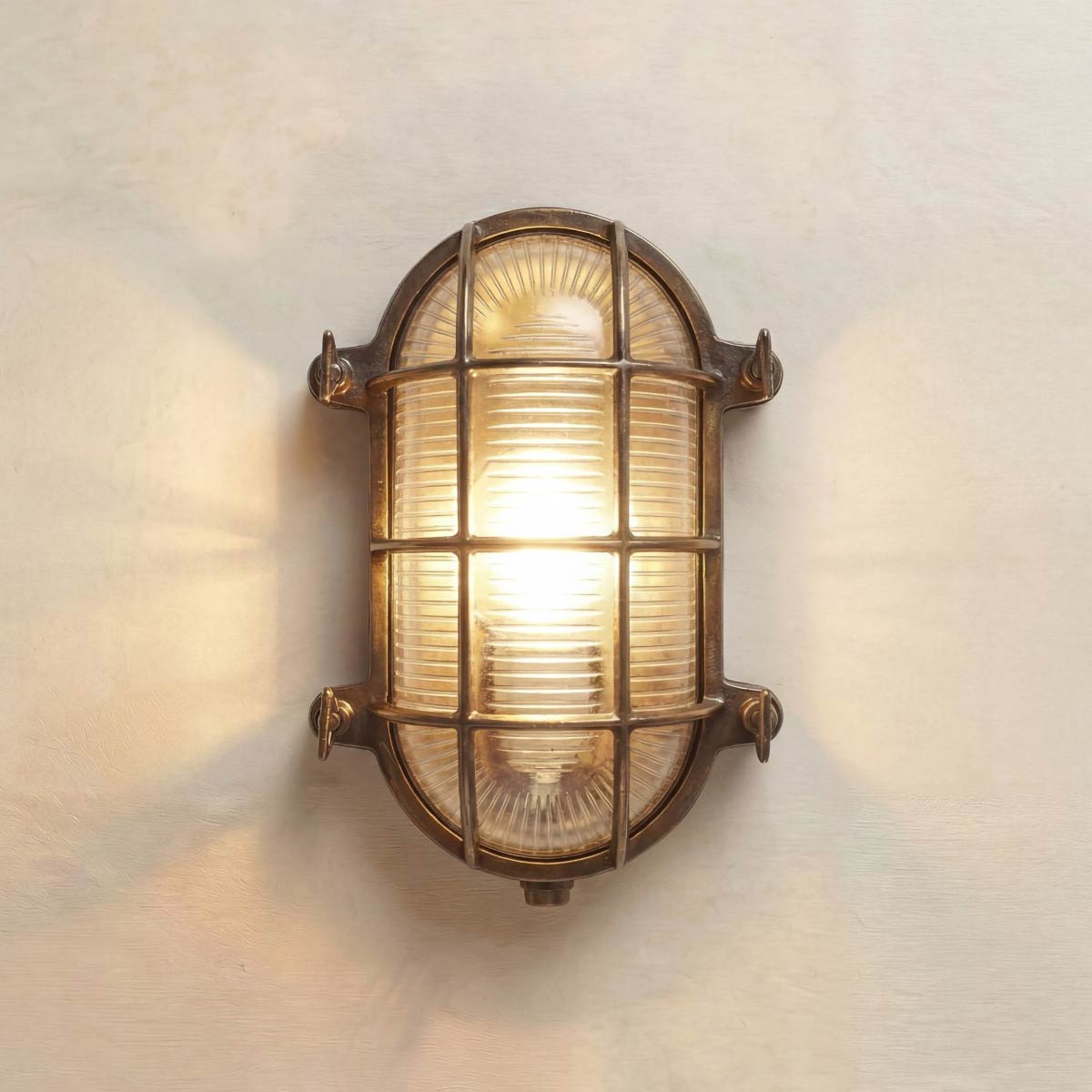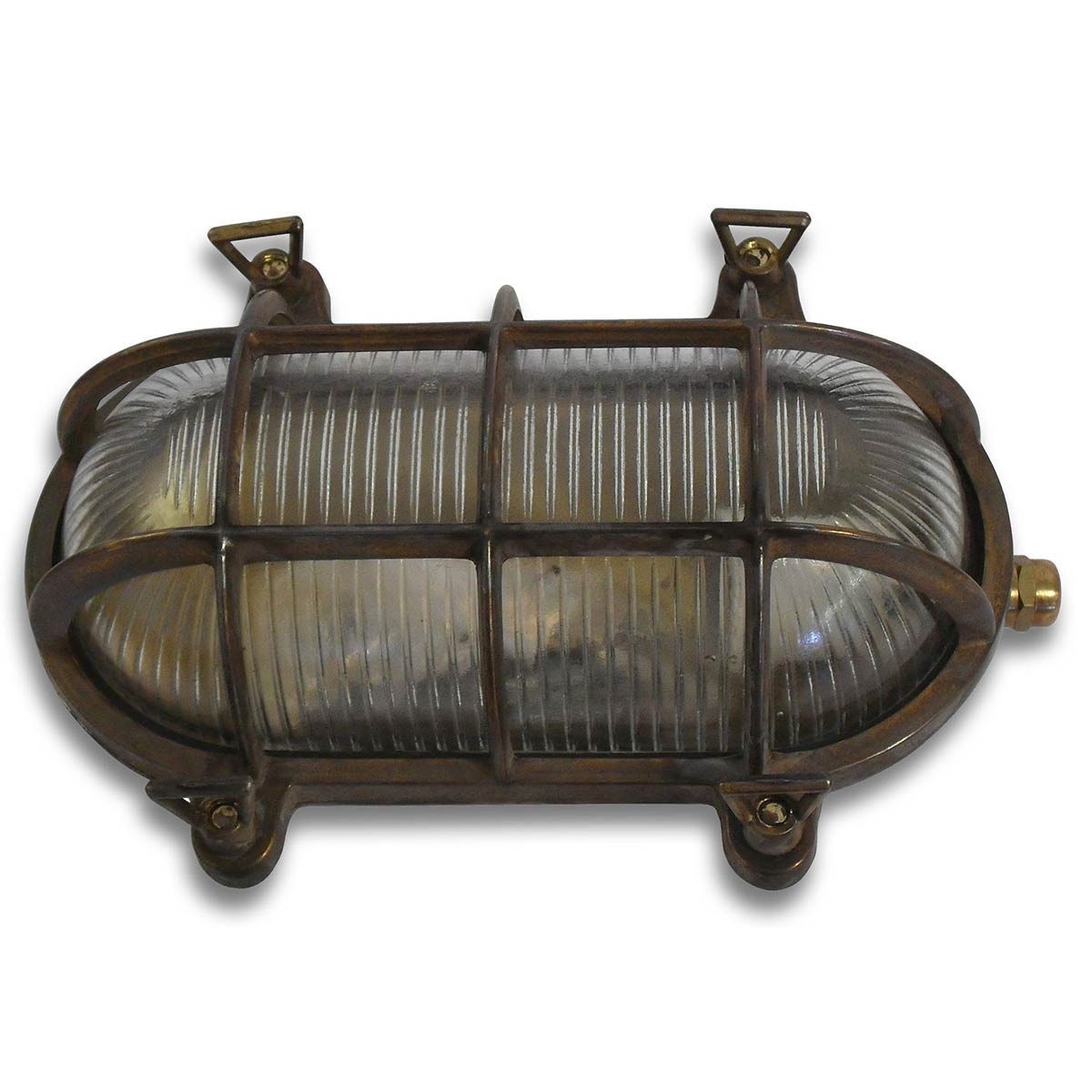 This large oval bulkhead light in solid antique brass is resistant to salt and corrosion. It will however tarnish and darken in use, which protects the brass from further degradation. This patina builds over time and is perfectly normal. It does not affect the fittings’ integrity to withstand the weather or degrade its IP rating.