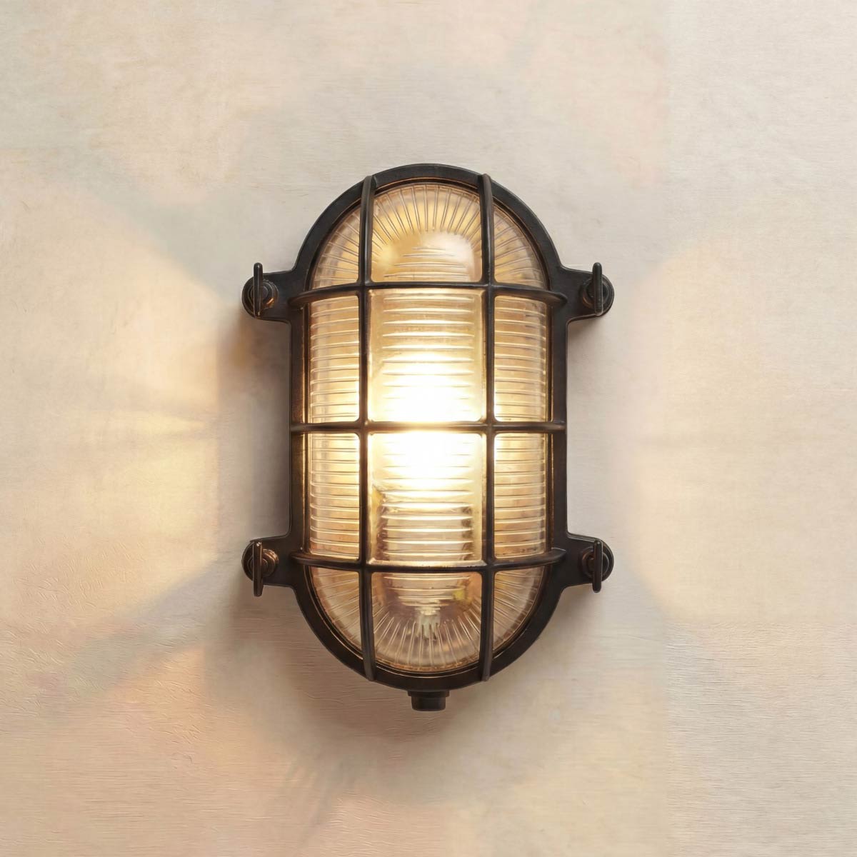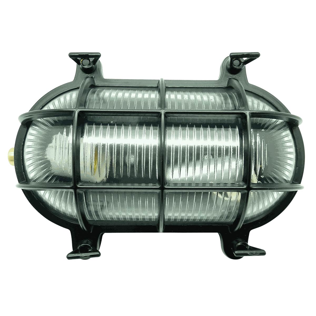 This large solid brass oval bulkhead light in black is rated IP64 and features classic nautical style. Safe to use outdoors in all weathers, it is made from black finish solid cast brass and ideal for use in severe weather coastal locations. Featuring a 25cm long oval body, with domed clear ribbed glass shade, protective bars and butterfly retaining nuts.