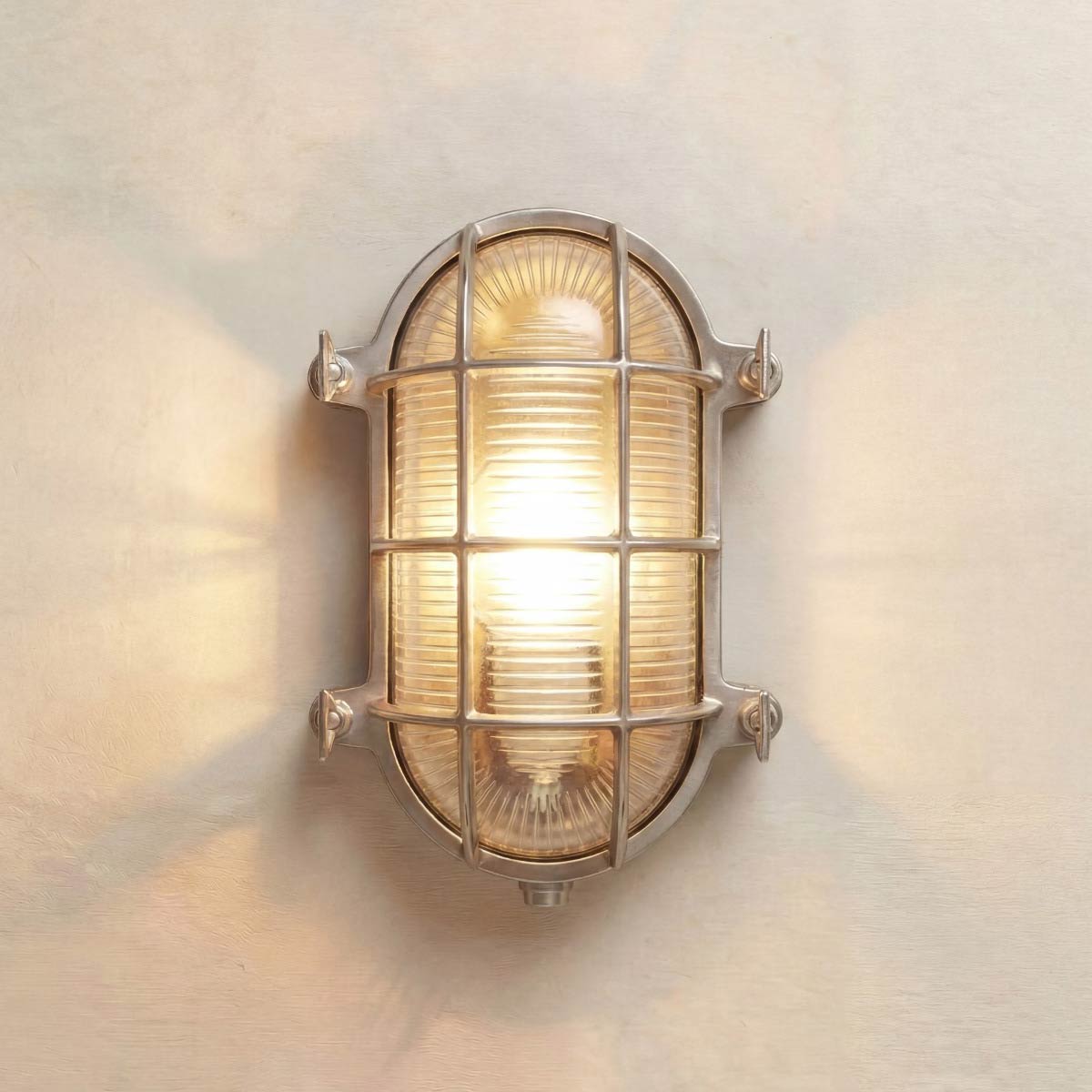 This large solid brass oval bulkhead light in satin nickel finish is rated IP64 and features classic nautical style. Safe to use outdoors in all weathers, it is made from nickel plated solid cast brass and ideal for use in severe weather coastal locations. Featuring a 25cm long oval body, with domed clear ribbed glass shade, protective bars and butterfly retaining nuts.