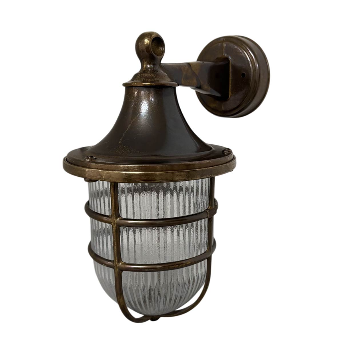This large Tiller solid antique brass outdoor wall lantern is rated IP64 and features nautical style. Safe to use outdoors in all weathers, it is made from antique finish solid cast brass and ideal for use in severe weather coastal locations. Featuring a circular wall mount, slender arm and downward facing ribbed pill glass shade with an outer protective cage.