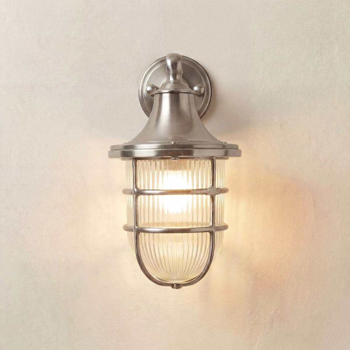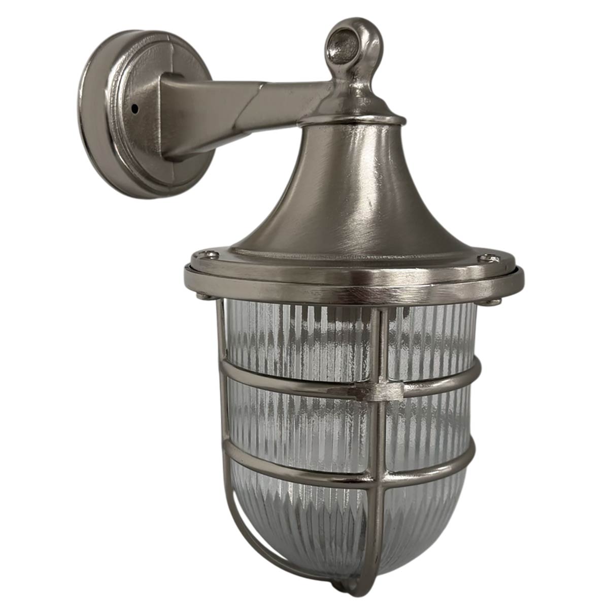 This large Tiller solid brass outdoor wall lantern in nickel finish is rated IP64 and features nautical style. Safe to use outdoors in all weathers, it is made from nickel plated solid cast brass and ideal for use in severe weather coastal locations. Featuring a circular wall mount, slender arm and downward facing ribbed pill glass shade with an outer protective cage.
